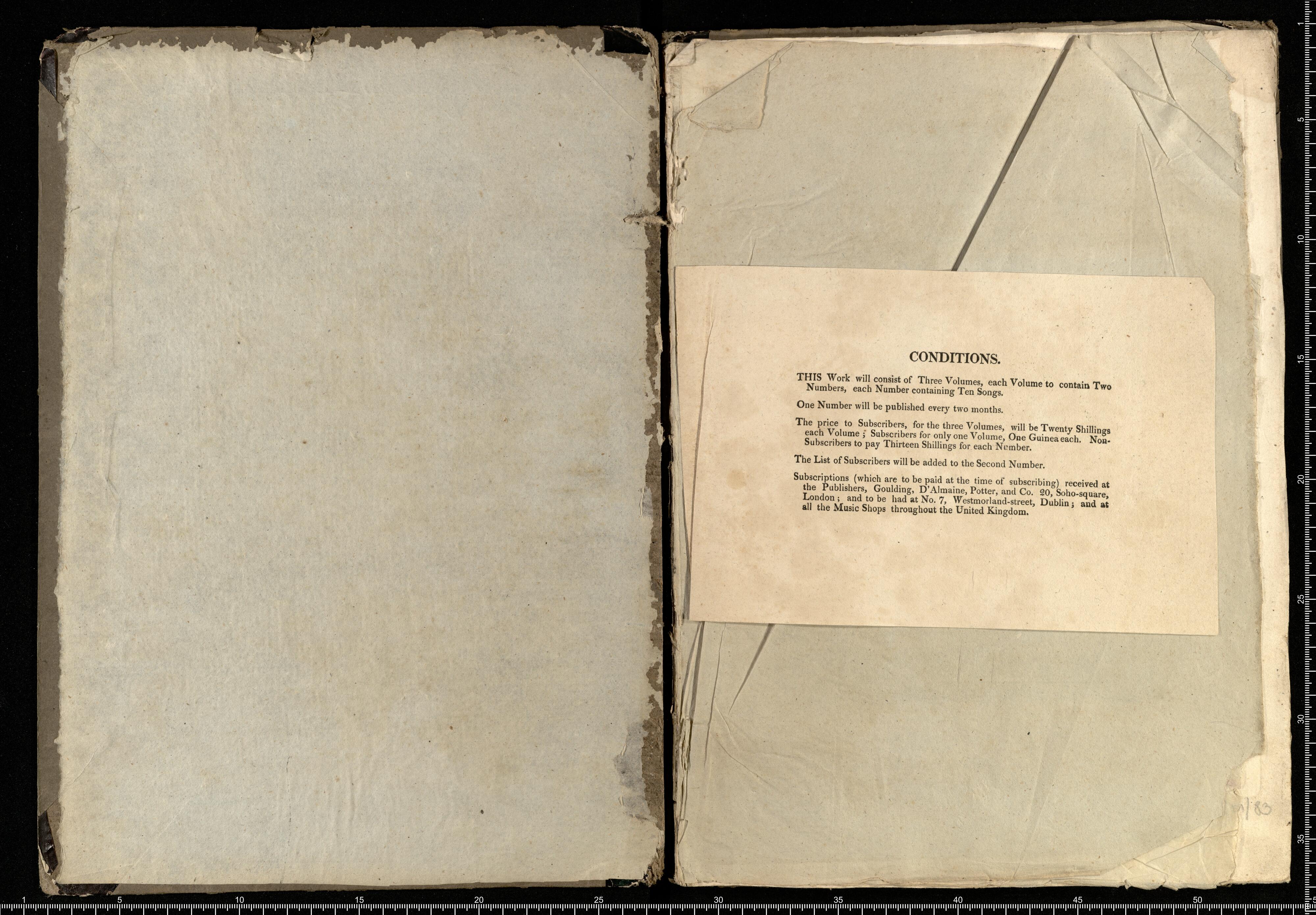 [cover title:] GERMAN | National Melodies. | [title page:] A Selection | of | GERMAN NATIONAL MELODIES, | With the Words both in the Original, and Translated into English, by | E. B. IMPEY, ESQ|R W. SOTHEBY, ESQ|R THE HON. W. SPENCER, | VISCOUNT STRANGFORD, W. TIGHE, ESQ|R AND S. TOLFREY, ESQ|R | The Whole Accompanied by | A TREATISE on NATIONAL MUSIC, | and the AIRS selected by | CHARLES BARON ARNIM. | [picture] | The Figures drawn by Mifs E. Beresford. Engraved by J. Powell. The Landscape by Count Jenison. | Vol. 1|s|t The introductory Symphonies by J. Mazzinghi. | London, Published by Goulding, D'Almaine, Potter, & C|o. 20, Soho Square, | and to be had at N|o 7, Westmoreland Street, Dublin