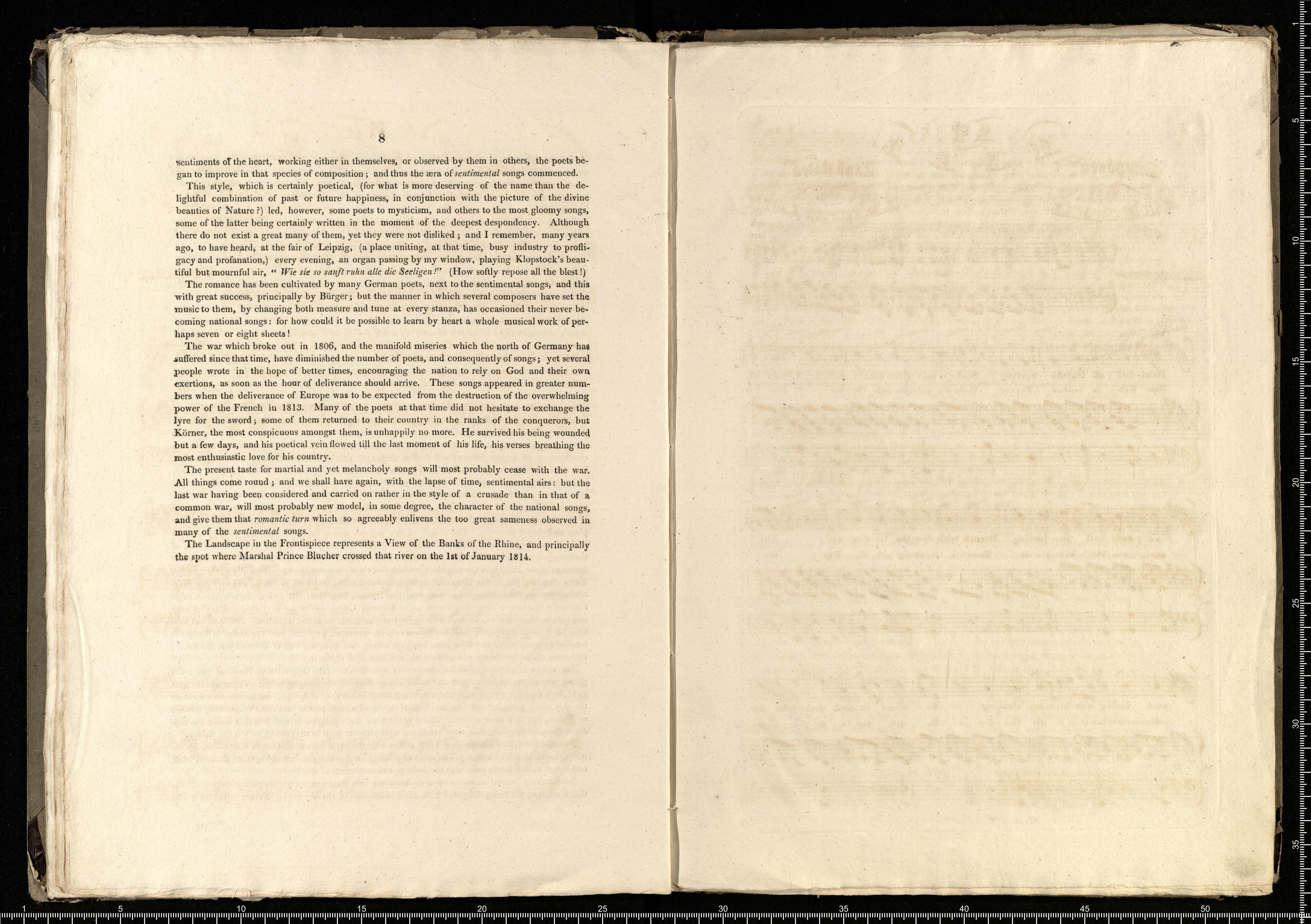 [cover title:] GERMAN | National Melodies. | [title page:] A Selection | of | GERMAN NATIONAL MELODIES, | With the Words both in the Original, and Translated into English, by | E. B. IMPEY, ESQ|R W. SOTHEBY, ESQ|R THE HON. W. SPENCER, | VISCOUNT STRANGFORD, W. TIGHE, ESQ|R AND S. TOLFREY, ESQ|R | The Whole Accompanied by | A TREATISE on NATIONAL MUSIC, | and the AIRS selected by | CHARLES BARON ARNIM. | [picture] | The Figures drawn by Mifs E. Beresford. Engraved by J. Powell. The Landscape by Count Jenison. | Vol. 1|s|t The introductory Symphonies by J. Mazzinghi. | London, Published by Goulding, D'Almaine, Potter, & C|o. 20, Soho Square, | and to be had at N|o 7, Westmoreland Street, Dublin
