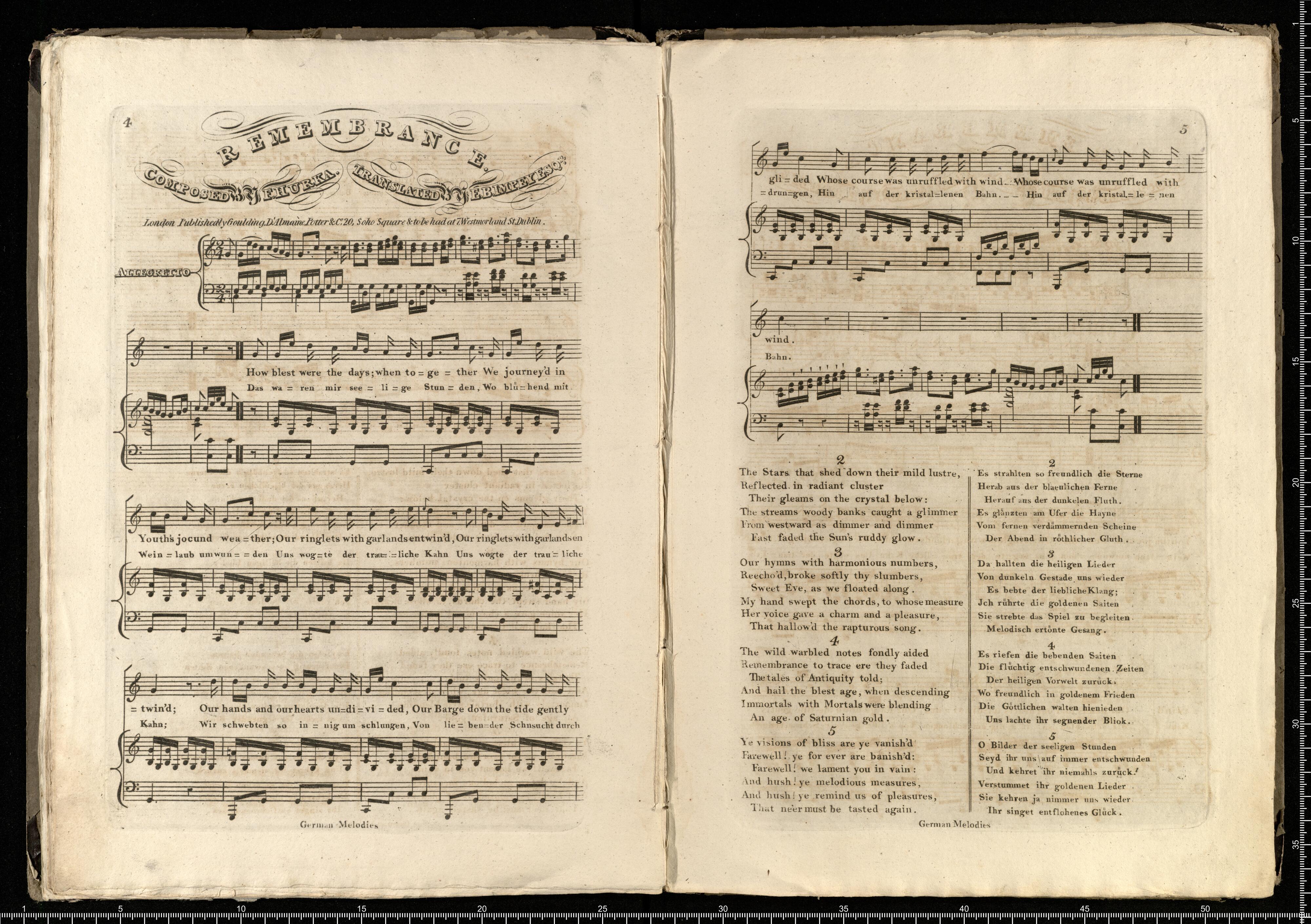 [cover title:] GERMAN | National Melodies. | [title page:] A Selection | of | GERMAN NATIONAL MELODIES, | With the Words both in the Original, and Translated into English, by | E. B. IMPEY, ESQ|R W. SOTHEBY, ESQ|R THE HON. W. SPENCER, | VISCOUNT STRANGFORD, W. TIGHE, ESQ|R AND S. TOLFREY, ESQ|R | The Whole Accompanied by | A TREATISE on NATIONAL MUSIC, | and the AIRS selected by | CHARLES BARON ARNIM. | [picture] | The Figures drawn by Mifs E. Beresford. Engraved by J. Powell. The Landscape by Count Jenison. | Vol. 1|s|t The introductory Symphonies by J. Mazzinghi. | London, Published by Goulding, D'Almaine, Potter, & C|o. 20, Soho Square, | and to be had at N|o 7, Westmoreland Street, Dublin
