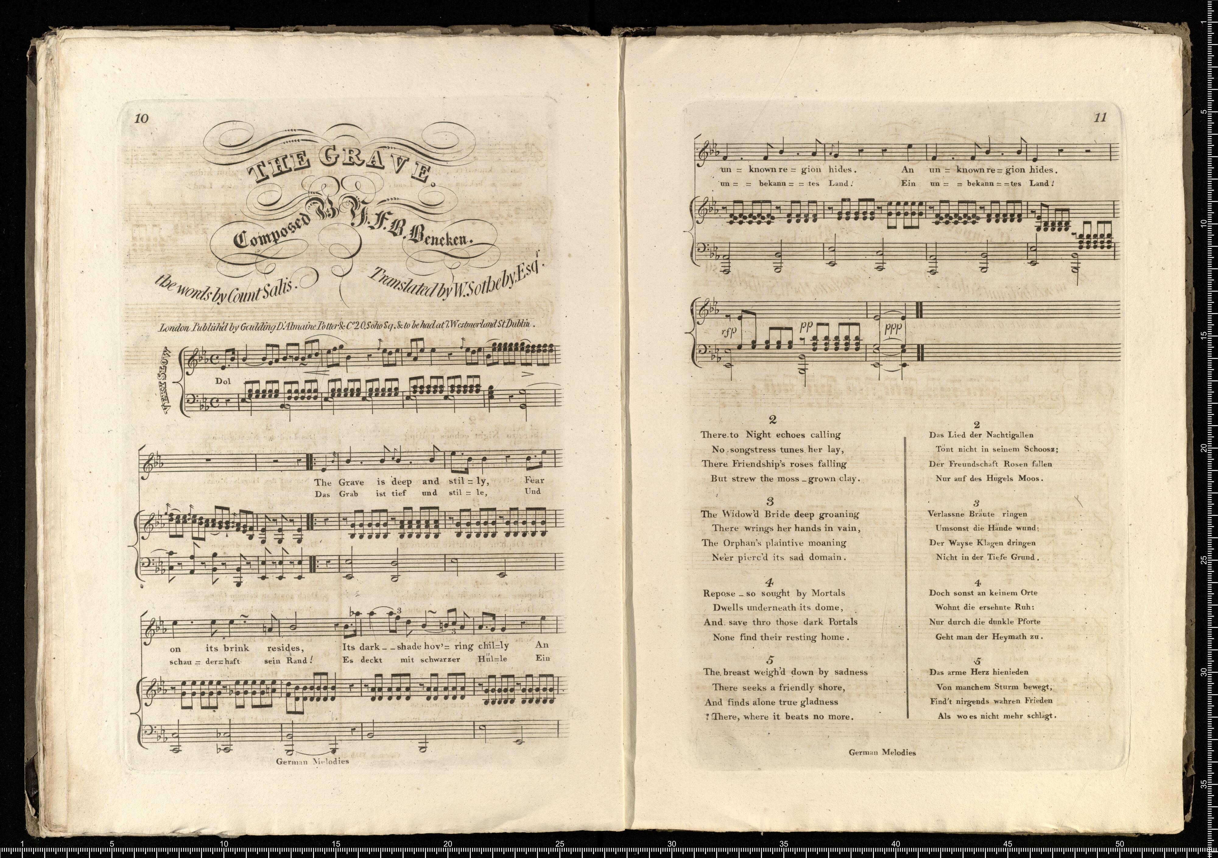 [cover title:] GERMAN | National Melodies. | [title page:] A Selection | of | GERMAN NATIONAL MELODIES, | With the Words both in the Original, and Translated into English, by | E. B. IMPEY, ESQ|R W. SOTHEBY, ESQ|R THE HON. W. SPENCER, | VISCOUNT STRANGFORD, W. TIGHE, ESQ|R AND S. TOLFREY, ESQ|R | The Whole Accompanied by | A TREATISE on NATIONAL MUSIC, | and the AIRS selected by | CHARLES BARON ARNIM. | [picture] | The Figures drawn by Mifs E. Beresford. Engraved by J. Powell. The Landscape by Count Jenison. | Vol. 1|s|t The introductory Symphonies by J. Mazzinghi. | London, Published by Goulding, D'Almaine, Potter, & C|o. 20, Soho Square, | and to be had at N|o 7, Westmoreland Street, Dublin