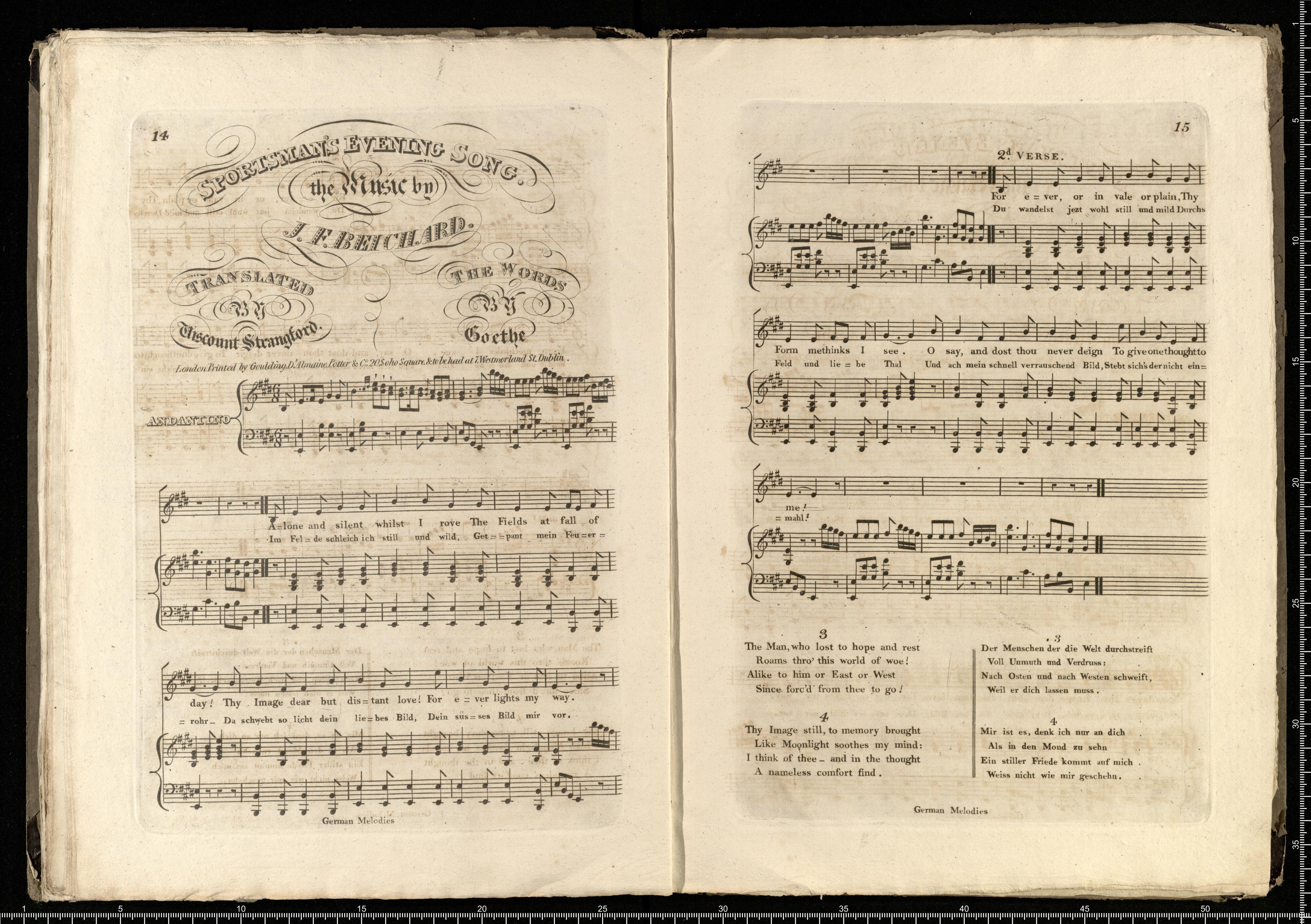 [cover title:] GERMAN | National Melodies. | [title page:] A Selection | of | GERMAN NATIONAL MELODIES, | With the Words both in the Original, and Translated into English, by | E. B. IMPEY, ESQ|R W. SOTHEBY, ESQ|R THE HON. W. SPENCER, | VISCOUNT STRANGFORD, W. TIGHE, ESQ|R AND S. TOLFREY, ESQ|R | The Whole Accompanied by | A TREATISE on NATIONAL MUSIC, | and the AIRS selected by | CHARLES BARON ARNIM. | [picture] | The Figures drawn by Mifs E. Beresford. Engraved by J. Powell. The Landscape by Count Jenison. | Vol. 1|s|t The introductory Symphonies by J. Mazzinghi. | London, Published by Goulding, D'Almaine, Potter, & C|o. 20, Soho Square, | and to be had at N|o 7, Westmoreland Street, Dublin