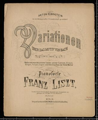 [title page:] ANTON RUBINSTEIN | in verehrungsvoller Freundschaft gewidmet. | Variationen | ÜBER DAS MOTIV VON BACH | [scores] | (Basso continuo des ersten Satzes seiner Cantate „Weinen, | Klagen, Sorgen, Zagen.” und des Crucifixus der H-moll-Messe) | für das | Pianoforte | von | FRANZ LISZT. | In dem Concert für das Bach-Monument vom Componisten vor | getragen am 28. April 1875 in Hannover. | Pr.M.3,50. | BERLIN, | Verlag und Eigenthum der SCHLESINGER'schen Buch & Musikhandlung | (ROB. LIENAU.) | Lith. von C. G. Röder, Leipzig, Variations pf f, Weinen Klagen Sorgen Zagen Var, Masses Excerpts Var b, Crucifixus Var e