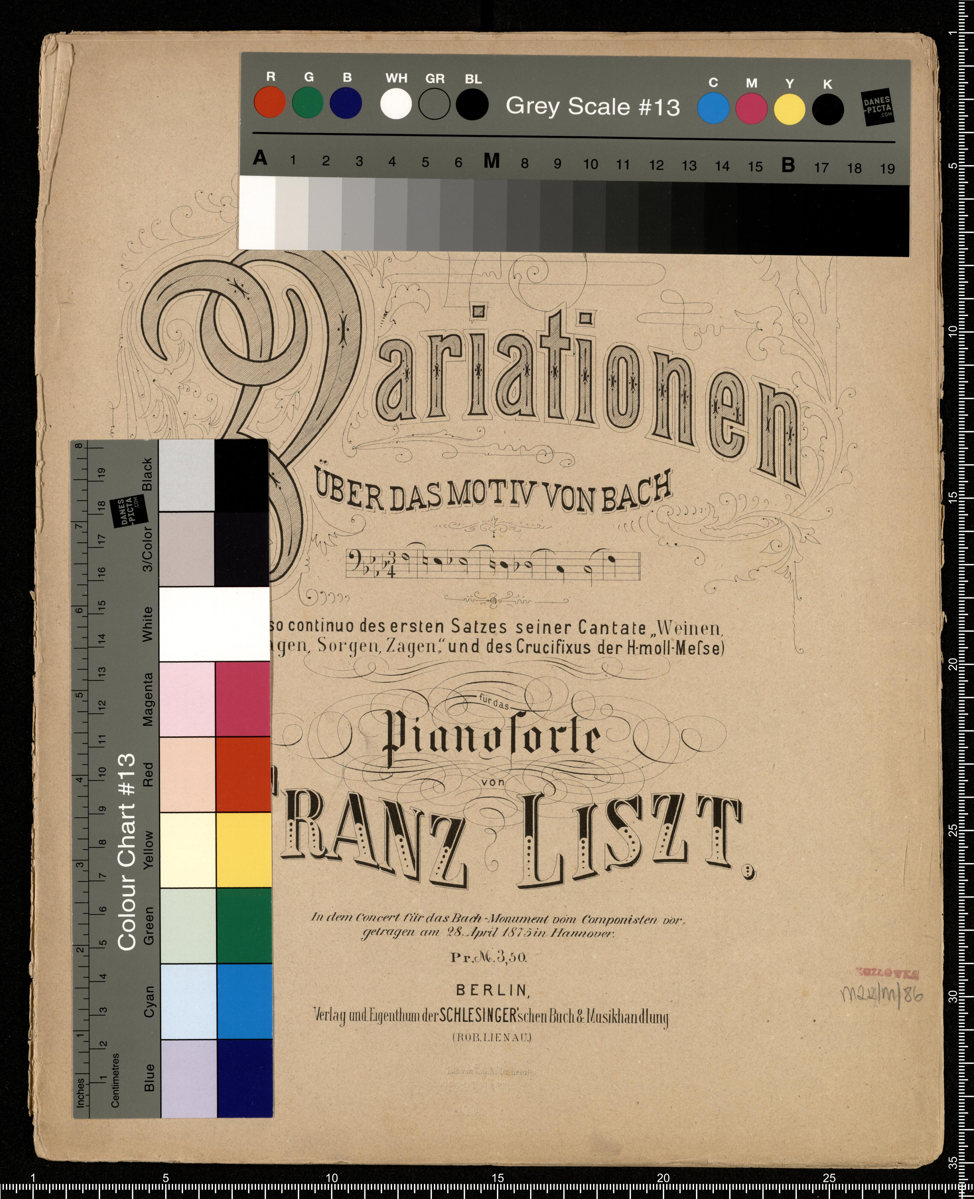 [title page:] ANTON RUBINSTEIN | in verehrungsvoller Freundschaft gewidmet. | Variationen | ÜBER DAS MOTIV VON BACH | [scores] | (Basso continuo des ersten Satzes seiner Cantate „Weinen, | Klagen, Sorgen, Zagen.” und des Crucifixus der H-moll-Messe) | für das | Pianoforte | von | FRANZ LISZT. | In dem Concert für das Bach-Monument vom Componisten vor | getragen am 28. April 1875 in Hannover. | Pr.M.3,50. | BERLIN, | Verlag und Eigenthum der SCHLESINGER'schen Buch & Musikhandlung | (ROB. LIENAU.) | Lith. von C. G. Röder, Leipzig