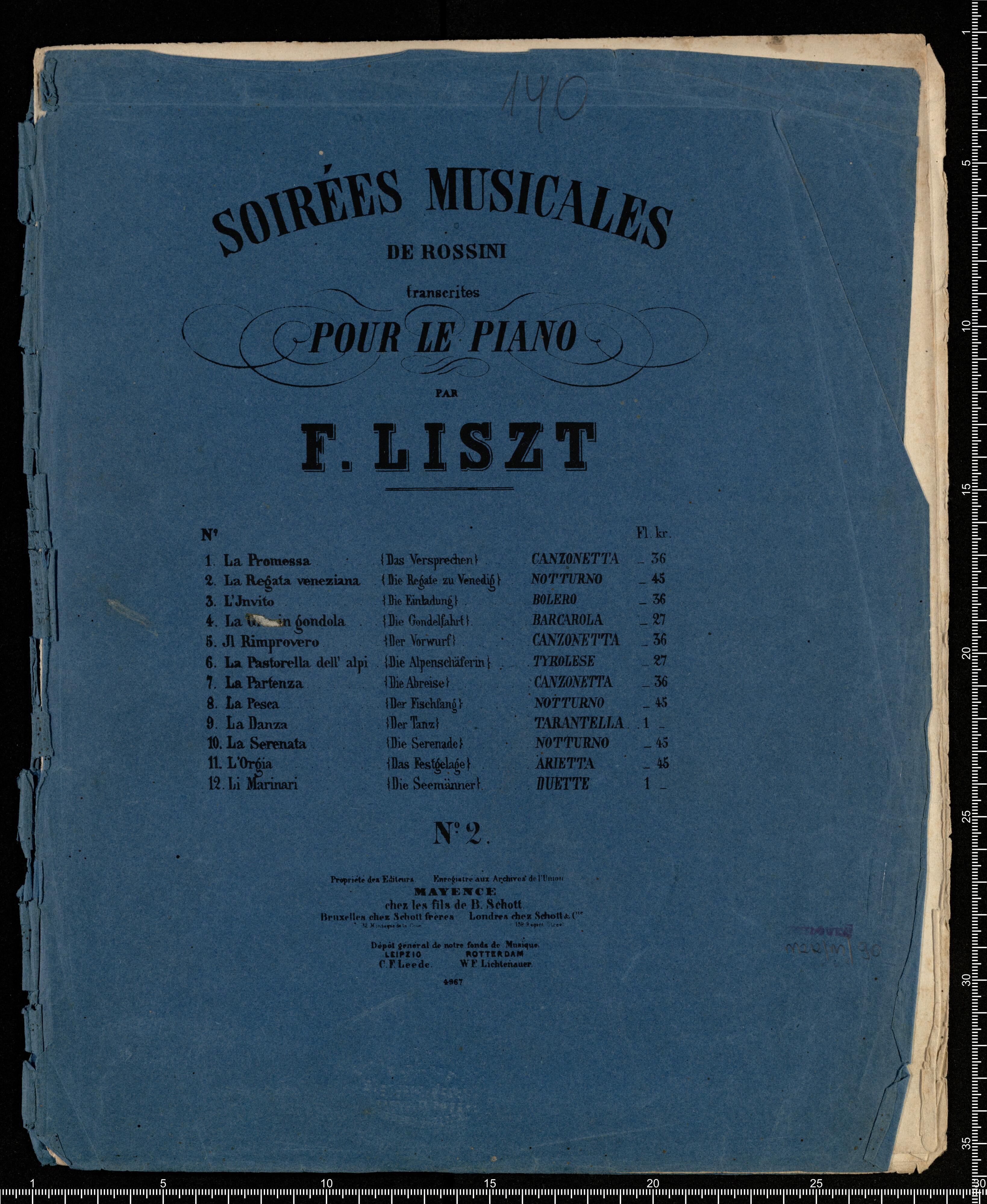 [title page:] à Madame la Comtesse | JULIE SAMOYLOFF | née Comtesse de Phalen. | Soirées Musicales | DE ROSSINI | transcrites pour le | PIANO | PAR | FRANÇOIS LISZT | N|o4966-67 Propriéte des Editeurs. Enregistré aux Archives de l'Union. Fr. | MAYENCE | chez les fils de B. Schott. | Bruxelles chez Schott frères. | 82 Montagne de la Cour. | Dépôl général de notre fonds de Musique | Leipzig C. F. Leede. Rotterdam W. F Lichtenauer
