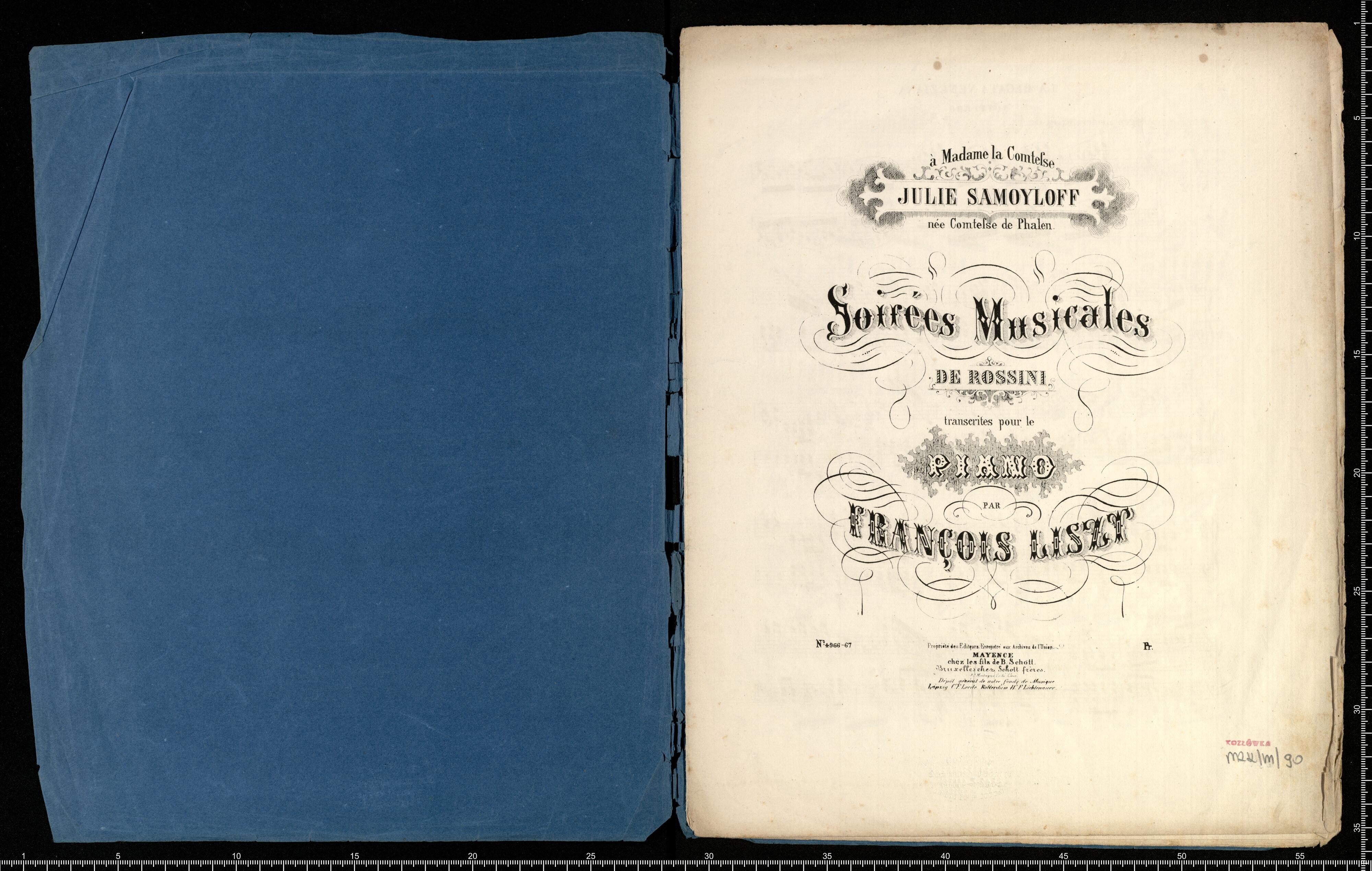 [title page:] à Madame la Comtesse | JULIE SAMOYLOFF | née Comtesse de Phalen. | Soirées Musicales | DE ROSSINI | transcrites pour le | PIANO | PAR | FRANÇOIS LISZT | N|o4966-67 Propriéte des Editeurs. Enregistré aux Archives de l'Union. Fr. | MAYENCE | chez les fils de B. Schott. | Bruxelles chez Schott frères. | 82 Montagne de la Cour. | Dépôl général de notre fonds de Musique | Leipzig C. F. Leede. Rotterdam W. F Lichtenauer