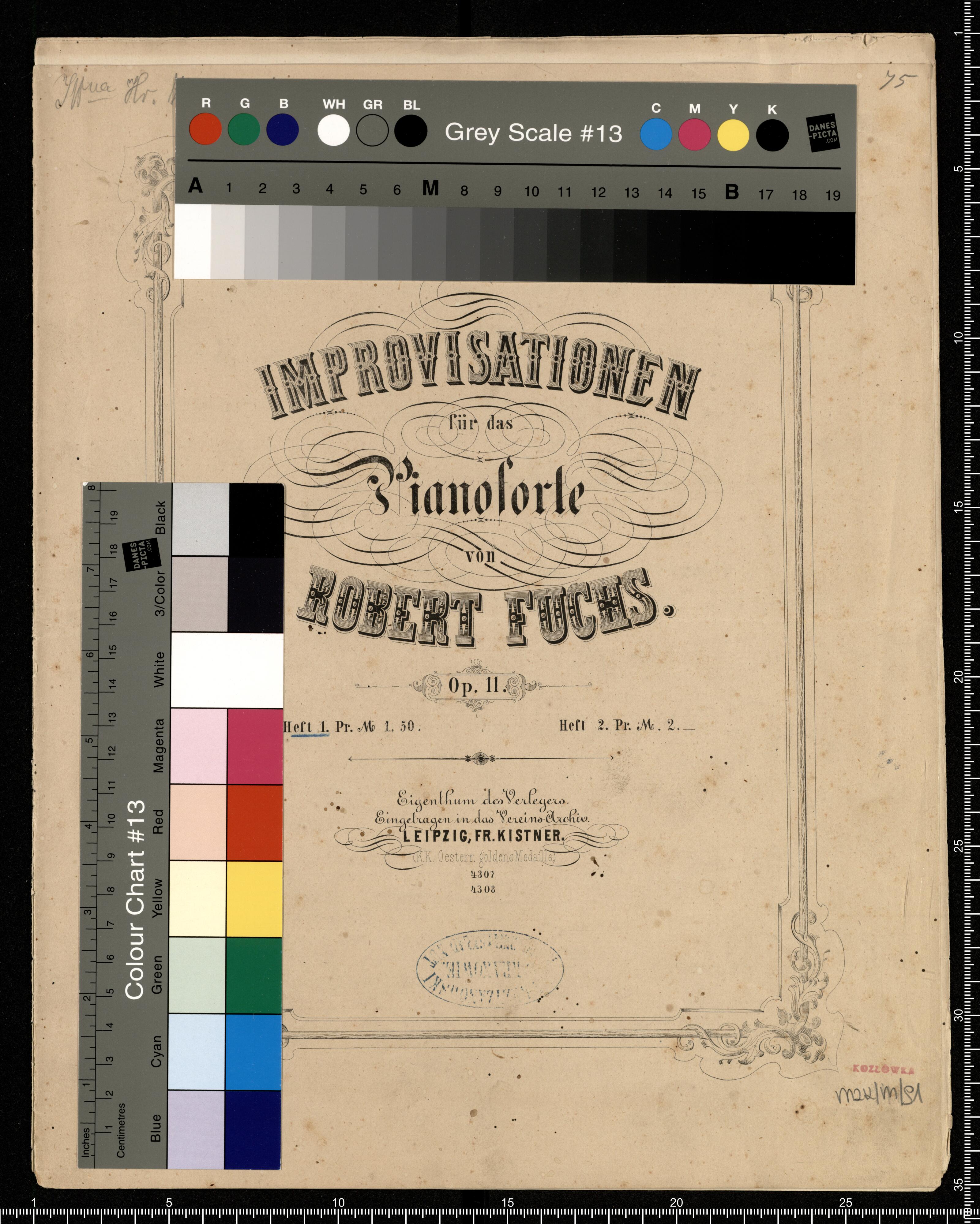 [title page:] IMPROVISATIONEN | für das | Pianoforte | von | ROBERT FUCHS. | Op. 11. | Heft 1. Pr. M 1. 50 | Heft 2. Pr. M. 2 | Eigenthum des Verlegers. | Eingetragen in das Vereins-Archiv. | LEIPZIG, FR. KISTNER. | (KK. Oesterr. goldene Medaille.) | 4307. | 4308