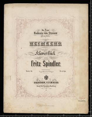 [title page:] An Frau | Eudoxie von Stresov | geb. von Hefse. | HEIMKEHR | Klavierstück | von | Fritz Spindler. | Werk 78. Eigenthum des Verlegers Pr.15 Ngr. | DRESDEN, C. F. MESER | Königl. Hof Musikalien Handlung. | 501. | Lith. Anst. von C. G. Röder in Leipzig, Heimkehr pf. 78 E|b