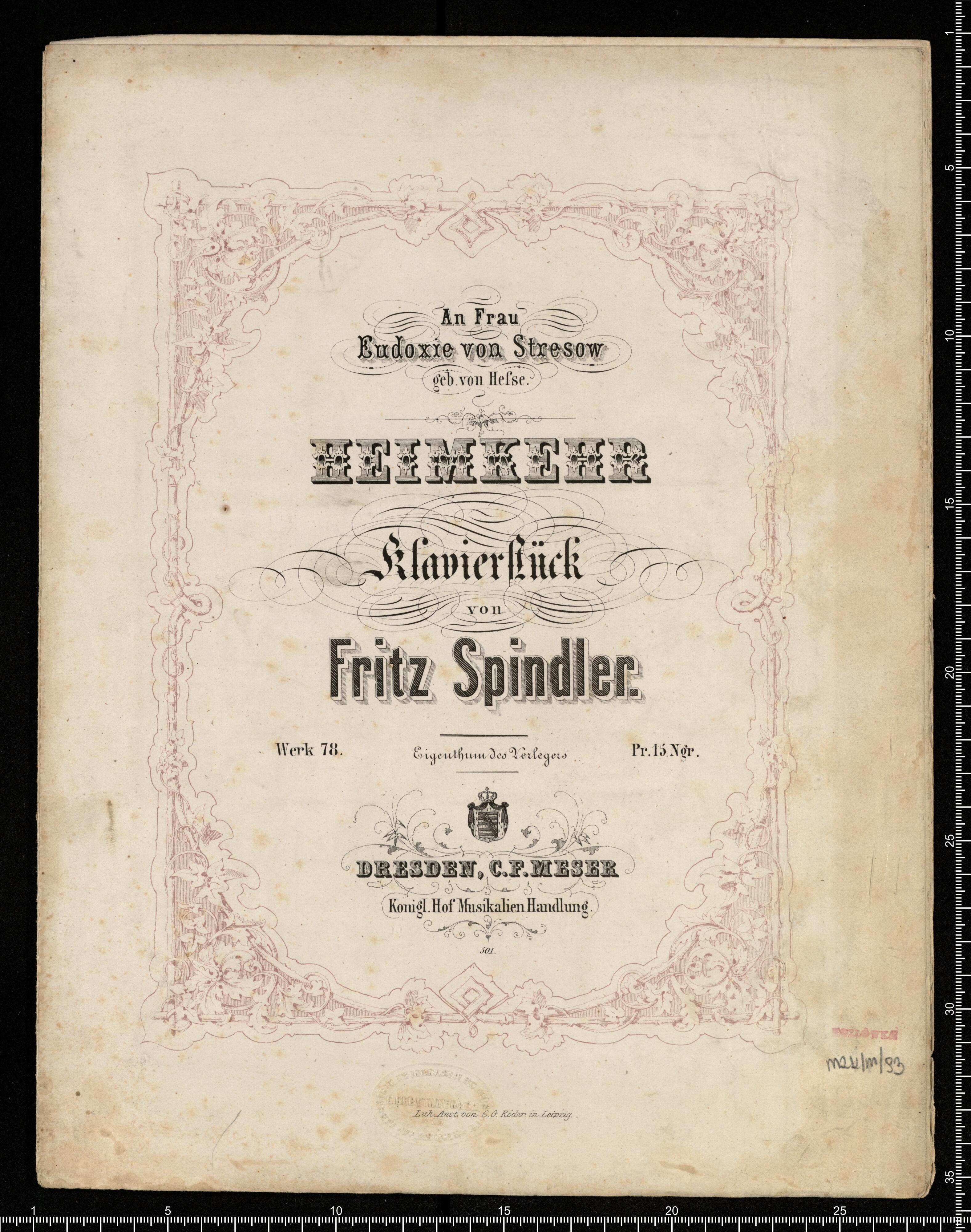 [title page:] An Frau | Eudoxie von Stresov | geb. von Hefse. | HEIMKEHR | Klavierstück | von | Fritz Spindler. | Werk 78. Eigenthum des Verlegers Pr.15 Ngr. | DRESDEN, C. F. MESER | Königl. Hof Musikalien Handlung. | 501. | Lith. Anst. von C. G. Röder in Leipzig