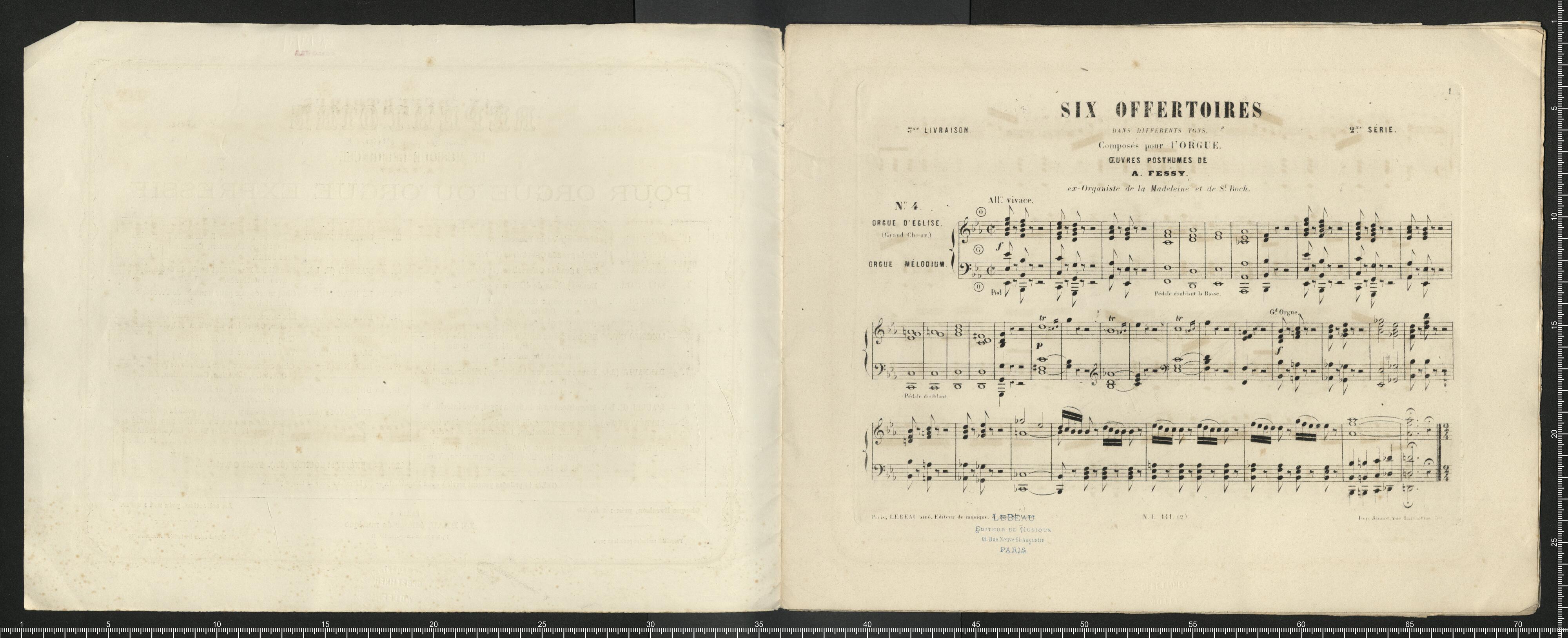 RÉPERTOIRE | DE MUSIQUE RELIGIEUSE | POUR ORGUE OU ORGUE EXPRESSIF | [first column:] 1. – FESSY (A.). Six Rentrées de Procession. | 2. – FESSY (A.). Trois grands Offertoires (1|r|e série). | 3. – FESSY (A.). Trois grands Offertoires (2|e série). | 4. – FALLOUARD. Douze pièces de différents caractères. | 5. – LORENZO (N.). Six morceaux faciles pur Rentrée de Proces- | sion, Offertoire, Élévation, Communion, | Sortie et Magnificat. | 6. – LORENZO (N.). Six morceaux faciles pur Rentrée de Proces- | sion, Offertoire, Élévation, Communion, | Sortie et Magnificat. | 7. – DARNAULT (B.). Douze morceaux, Antiennes Préludes, Rentrée | de Prosession, Offertoire, Élévation, Com- | munion et Sortie. | 8. – D'AUBEL (H. L.) Magnificat en fa du 6|e ton royal, avec interludes. | 9. – LEPRÉVOST (Alex.) Cinq morceaux de Rentrée, Procession, Offer- | toire, Élévation, Communion et Sortie. | 10. – DURAND (Aug.). Cinq morceaux pour Rentrée de Procession, | Offertoire, Élévation, Communion, Verset | et Sortie. | [second column:] 11. – LEFÉBURE-WÉLY. Six morceaux pour Rentrée de Procession, | Offertoire, Élévation, Communion, Verset | et Sortie. | 12. – D'AUBEL (H. L.) Deuxième Magnificat en fa, du 6|e ton royal, | avec interludes. | 13. – LE BEAU (Alf.) Cinq morceaux pour Rentrée de Procession, | Offertoire, Élévation et Sortie. | 14. – LORENZO (N.). Six morceaux faciles pour Rentrée de Proces- | sion, Offertoire, Élévation et trois Sorties. | 15. – BLONDEL (Ch.) Cinq hymnes, avec interludes. | 16. – BLONDEL (Ch.) Te Deum, avec interludes (|1). | 17. – DURAND (Aug.). Cinq morceaux pour Rentrée de Procession, | Offertoire, Élévation, Communion, Sortie (|2). | 18. – DURAND (Aug.). Cinq morceaux pour Rentrée de Procession, | Offertoire, Élévation, Communion, Sortie. | 19. – LEPRÉVOST (Alex.) Six morceaux composés pour la célébration | des obsèques ou un service non chanté : | 1|o avant la Messe, 2|o au commencement | de la Messe, 3|o apres l'Épitre, 4|o Offer- | toire, 5|o Élévation, 6|o Sortie. | 20. – BENOIST et GOUNOD (Ch.) Trois Offertoires. [end of colums] | (1) Les 15 préludes peuvent servir à deux Magnificats. – (2) Livraison pour le temps pascal. | [first column:] Chaque livraison, prix : 7 fr. 50 | Propriété exclusive pour tout pays. | [second column:] PARIS | LE BEAU, éditeur de musique | 11, RUE NEUAE-SAINT-AUGUSTIN, 11 | [third column:] La collection, prix net : 30 fr. | Déposé selon les traités internationaux. [end of columns] | [by pencil:] 1fr 70 =