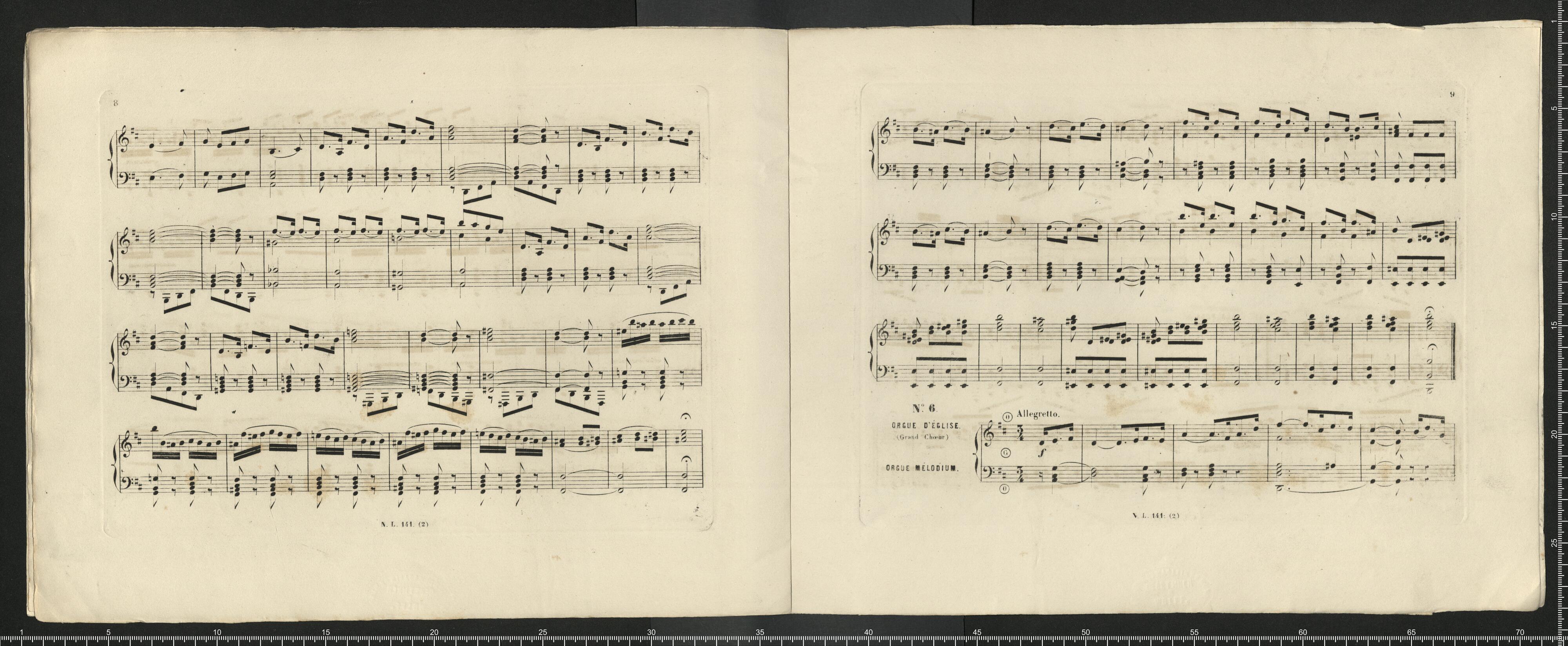 RÉPERTOIRE | DE MUSIQUE RELIGIEUSE | POUR ORGUE OU ORGUE EXPRESSIF | [first column:] 1. – FESSY (A.). Six Rentrées de Procession. | 2. – FESSY (A.). Trois grands Offertoires (1|r|e série). | 3. – FESSY (A.). Trois grands Offertoires (2|e série). | 4. – FALLOUARD. Douze pièces de différents caractères. | 5. – LORENZO (N.). Six morceaux faciles pur Rentrée de Proces- | sion, Offertoire, Élévation, Communion, | Sortie et Magnificat. | 6. – LORENZO (N.). Six morceaux faciles pur Rentrée de Proces- | sion, Offertoire, Élévation, Communion, | Sortie et Magnificat. | 7. – DARNAULT (B.). Douze morceaux, Antiennes Préludes, Rentrée | de Prosession, Offertoire, Élévation, Com- | munion et Sortie. | 8. – D'AUBEL (H. L.) Magnificat en fa du 6|e ton royal, avec interludes. | 9. – LEPRÉVOST (Alex.) Cinq morceaux de Rentrée, Procession, Offer- | toire, Élévation, Communion et Sortie. | 10. – DURAND (Aug.). Cinq morceaux pour Rentrée de Procession, | Offertoire, Élévation, Communion, Verset | et Sortie. | [second column:] 11. – LEFÉBURE-WÉLY. Six morceaux pour Rentrée de Procession, | Offertoire, Élévation, Communion, Verset | et Sortie. | 12. – D'AUBEL (H. L.) Deuxième Magnificat en fa, du 6|e ton royal, | avec interludes. | 13. – LE BEAU (Alf.) Cinq morceaux pour Rentrée de Procession, | Offertoire, Élévation et Sortie. | 14. – LORENZO (N.). Six morceaux faciles pour Rentrée de Proces- | sion, Offertoire, Élévation et trois Sorties. | 15. – BLONDEL (Ch.) Cinq hymnes, avec interludes. | 16. – BLONDEL (Ch.) Te Deum, avec interludes (|1). | 17. – DURAND (Aug.). Cinq morceaux pour Rentrée de Procession, | Offertoire, Élévation, Communion, Sortie (|2). | 18. – DURAND (Aug.). Cinq morceaux pour Rentrée de Procession, | Offertoire, Élévation, Communion, Sortie. | 19. – LEPRÉVOST (Alex.) Six morceaux composés pour la célébration | des obsèques ou un service non chanté : | 1|o avant la Messe, 2|o au commencement | de la Messe, 3|o apres l'Épitre, 4|o Offer- | toire, 5|o Élévation, 6|o Sortie. | 20. – BENOIST et GOUNOD (Ch.) Trois Offertoires. [end of colums] | (1) Les 15 préludes peuvent servir à deux Magnificats. – (2) Livraison pour le temps pascal. | [first column:] Chaque livraison, prix : 7 fr. 50 | Propriété exclusive pour tout pays. | [second column:] PARIS | LE BEAU, éditeur de musique | 11, RUE NEUAE-SAINT-AUGUSTIN, 11 | [third column:] La collection, prix net : 30 fr. | Déposé selon les traités internationaux. [end of columns] | [by pencil:] 1fr 70 =