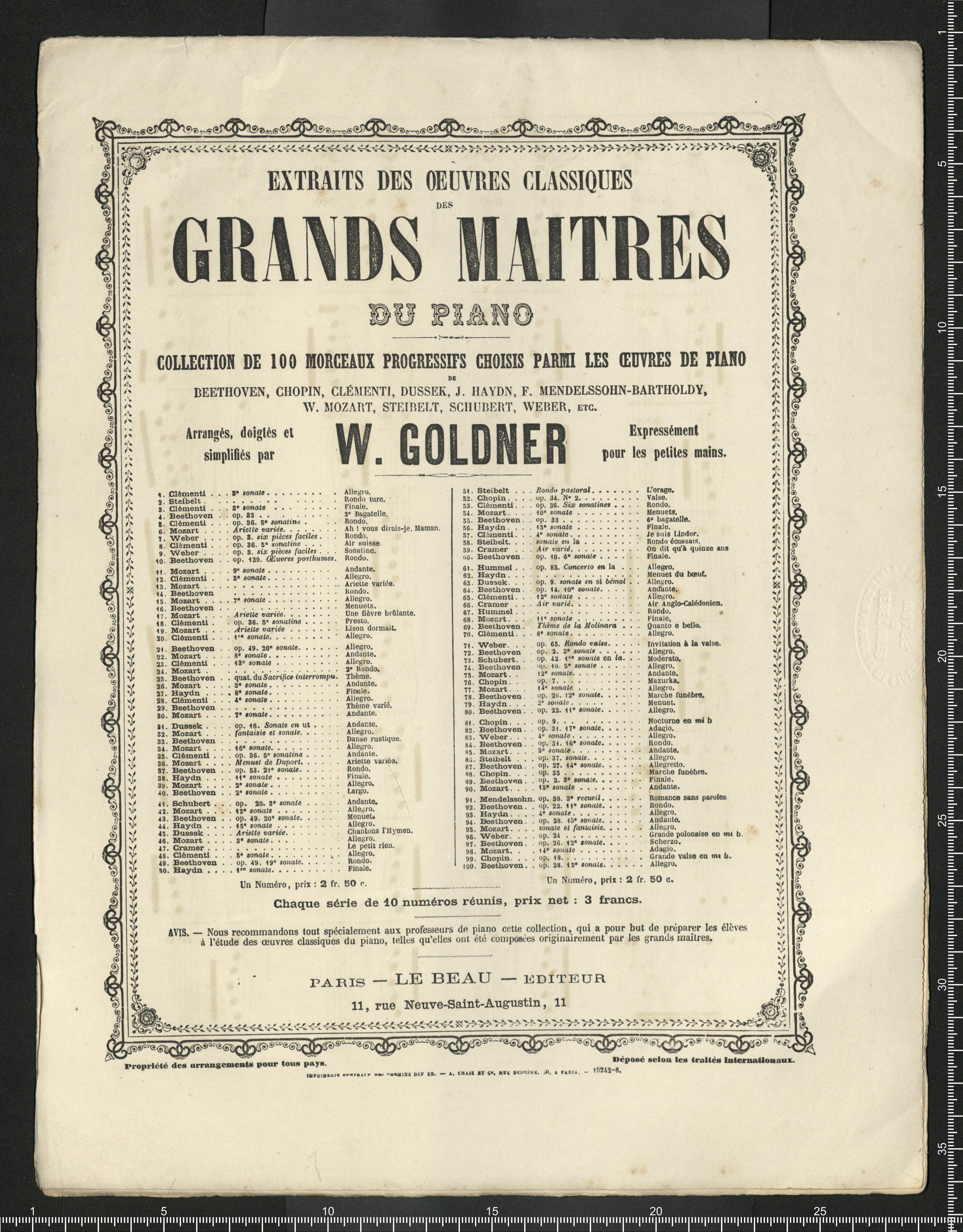 RÉPERTOIRE | DE MUSIQUE RELIGIEUSE | POUR ORGUE OU ORGUE EXPRESSIF | [first column:] 1. – FESSY (A.). Six Rentrées de Procession. | 2. – FESSY (A.). Trois grands Offertoires (1|r|e série). | 3. – FESSY (A.). Trois grands Offertoires (2|e série). | 4. – FALLOUARD. Douze pièces de différents caractères. | 5. – LORENZO (N.). Six morceaux faciles pur Rentrée de Proces- | sion, Offertoire, Élévation, Communion, | Sortie et Magnificat. | 6. – LORENZO (N.). Six morceaux faciles pur Rentrée de Proces- | sion, Offertoire, Élévation, Communion, | Sortie et Magnificat. | 7. – DARNAULT (B.). Douze morceaux, Antiennes Préludes, Rentrée | de Prosession, Offertoire, Élévation, Com- | munion et Sortie. | 8. – D'AUBEL (H. L.) Magnificat en fa du 6|e ton royal, avec interludes. | 9. – LEPRÉVOST (Alex.) Cinq morceaux de Rentrée, Procession, Offer- | toire, Élévation, Communion et Sortie. | 10. – DURAND (Aug.). Cinq morceaux pour Rentrée de Procession, | Offertoire, Élévation, Communion, Verset | et Sortie. | [second column:] 11. – LEFÉBURE-WÉLY. Six morceaux pour Rentrée de Procession, | Offertoire, Élévation, Communion, Verset | et Sortie. | 12. – D'AUBEL (H. L.) Deuxième Magnificat en fa, du 6|e ton royal, | avec interludes. | 13. – LE BEAU (Alf.) Cinq morceaux pour Rentrée de Procession, | Offertoire, Élévation et Sortie. | 14. – LORENZO (N.). Six morceaux faciles pour Rentrée de Proces- | sion, Offertoire, Élévation et trois Sorties. | 15. – BLONDEL (Ch.) Cinq hymnes, avec interludes. | 16. – BLONDEL (Ch.) Te Deum, avec interludes (|1). | 17. – DURAND (Aug.). Cinq morceaux pour Rentrée de Procession, | Offertoire, Élévation, Communion, Sortie (|2). | 18. – DURAND (Aug.). Cinq morceaux pour Rentrée de Procession, | Offertoire, Élévation, Communion, Sortie. | 19. – LEPRÉVOST (Alex.) Six morceaux composés pour la célébration | des obsèques ou un service non chanté : | 1|o avant la Messe, 2|o au commencement | de la Messe, 3|o apres l'Épitre, 4|o Offer- | toire, 5|o Élévation, 6|o Sortie. | 20. – BENOIST et GOUNOD (Ch.) Trois Offertoires. [end of colums] | (1) Les 15 préludes peuvent servir à deux Magnificats. – (2) Livraison pour le temps pascal. | [first column:] Chaque livraison, prix : 7 fr. 50 | Propriété exclusive pour tout pays. | [second column:] PARIS | LE BEAU, éditeur de musique | 11, RUE NEUAE-SAINT-AUGUSTIN, 11 | [third column:] La collection, prix net : 30 fr. | Déposé selon les traités internationaux. [end of columns] | [by pencil:] 1fr 70 =