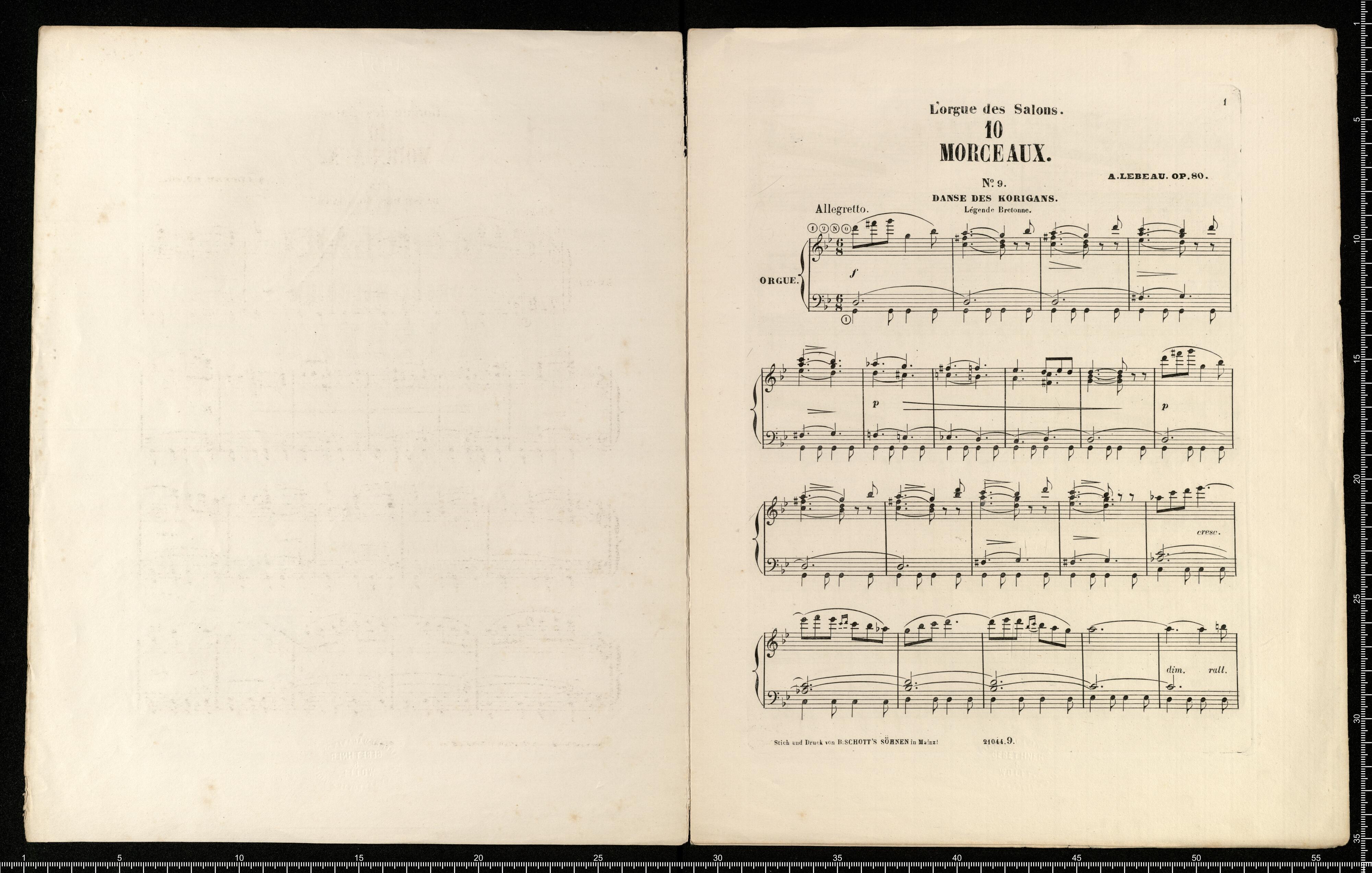 L'OURGE DES SALONS | 10 | MORCEAUX | POUR | ORGUE-MÉLODIUM | PAR | A. LEBEAU | No. 1. Sérénade de Gounod, Transcription, Pr. 18 Kr. | No. 2 Rêverie, „ 27 „ | No. 3. Une Plainte, Elégie, „ 27 „ | No. 4. Ronde du Guet, Marche, „ 27 „ | No. 5. Au Bord de la Mer, Romance, „ 27 „ | No. 6. Marche des Hallebardiers, „ 27 „ | No. 7. Nocturne, „ 27 „ | No. 8. Villanelle, „ 27 „ | No. 9. Danse des Korigans, Legende bretonne, „ 27 „ | No. 10. A la Chapelle, Prière, „ 27 „ | Propriété des Editeurs. | MAYENCE CHEZ LES FILS DE B. SCHOTT. | Bruxelles, Schott frères. Londres, Schott & Cie. | 82 Montagne de la Cour. 159 Regent Street. | Dépôt général de notre fonds de Musique: | LEIPZIG, C. F. LEEDE. | Enregistré aux Archives de l'Union, et à Stationers Hall. | 21044