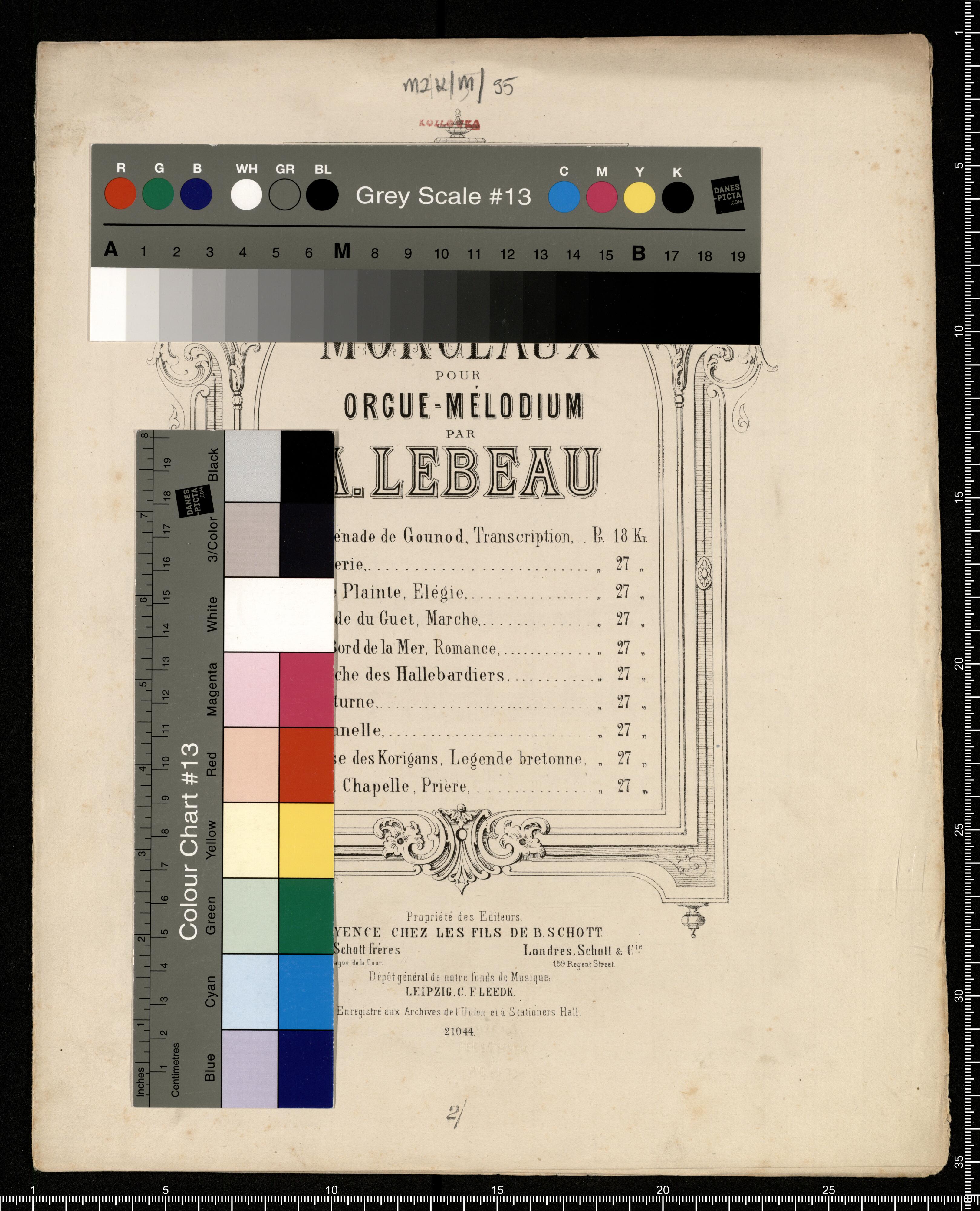 L'OURGE DES SALONS | 10 | MORCEAUX | POUR | ORGUE-MÉLODIUM | PAR | A. LEBEAU | No. 1. Sérénade de Gounod, Transcription, Pr. 18 Kr. | No. 2 Rêverie, „ 27 „ | No. 3. Une Plainte, Elégie, „ 27 „ | No. 4. Ronde du Guet, Marche, „ 27 „ | No. 5. Au Bord de la Mer, Romance, „ 27 „ | No. 6. Marche des Hallebardiers, „ 27 „ | No. 7. Nocturne, „ 27 „ | No. 8. Villanelle, „ 27 „ | No. 9. Danse des Korigans, Legende bretonne, „ 27 „ | No. 10. A la Chapelle, Prière, „ 27 „ | Propriété des Editeurs. | MAYENCE CHEZ LES FILS DE B. SCHOTT. | Bruxelles, Schott frères. Londres, Schott & Cie. | 82 Montagne de la Cour. 159 Regent Street. | Dépôt général de notre fonds de Musique: | LEIPZIG, C. F. LEEDE. | Enregistré aux Archives de l'Union, et à Stationers Hall. | 21044