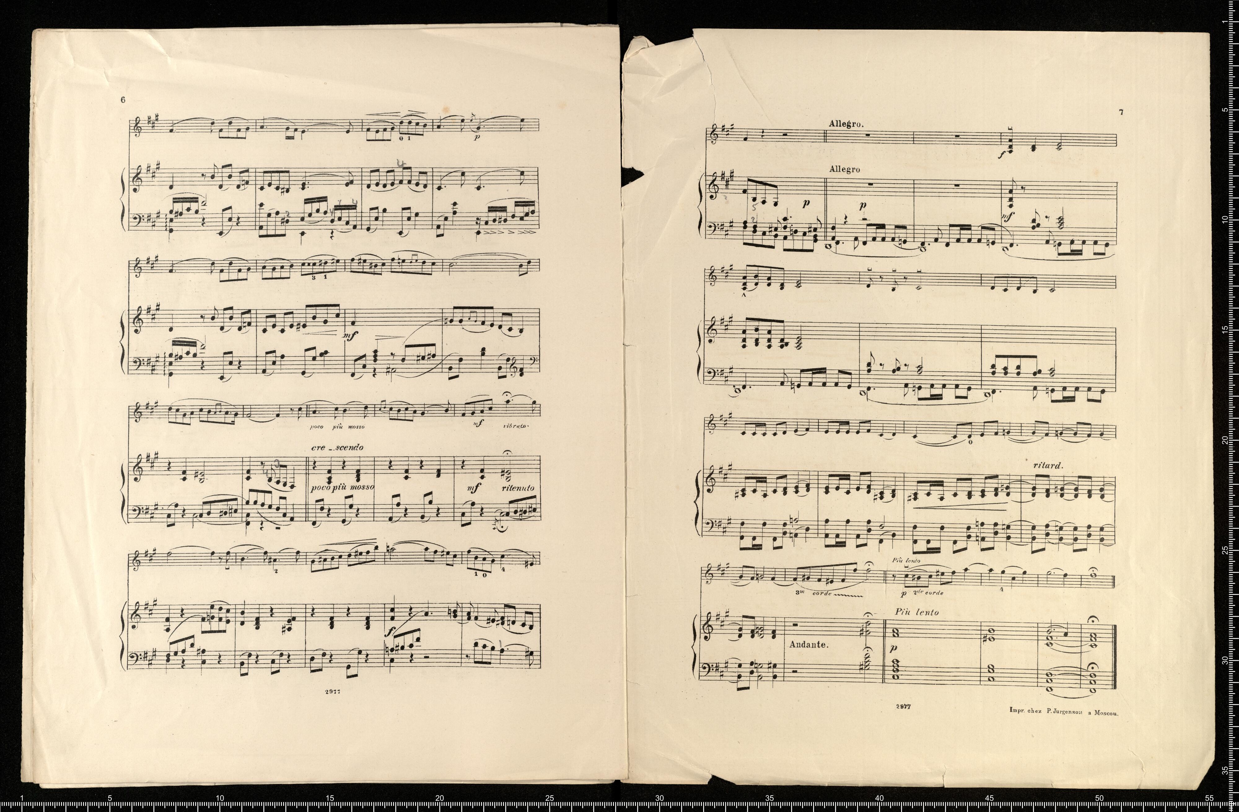 [title page:] HUIT MORCEAUX | arrangés pour Violon et Piano | par | N. DE SWETT. | N [space] K. | 1. [bold:] Tschaïkowsky, [bold:] P. Op. 2 N [underlinded:] o 3. Chant sans paroles [dots] 40 | [underlined:] 2. [space] [horizontal line] [space] „ [underlined:] 5 [undelined:] Romance [dots] [undelined:] 50 | 3. [space] [horizontal line] [space] „ 27 N [underlined:] o 4. Le Soir [dots] 40 | 4. [space] [horizontal line] [space] „ 9 N [underlined:] o 1. Rêverie [dots] 70 | 5. [space] [horizontal line] [space] „ 37|b|i|s No 6. Barcarolle [dots] 70 | 6. [bold:] Rubinstein, [bold:] A. Op. 30. 1|r|e Barcarolle [dots] 60 | 7. [bold:] Junkelmann. Romance [dots] 50 | 8. [bold:] Knina, [bold:] L. Mélodie [dots] 40 | Propriété de l'éditeur. | MOSCOU chez P. JURGENSON. | St.-Pétersbourg chez J. Jurgenson. | Varsovie chez G. Sennewald. | Imprimerie de musique P. Jurgenson à Moscou