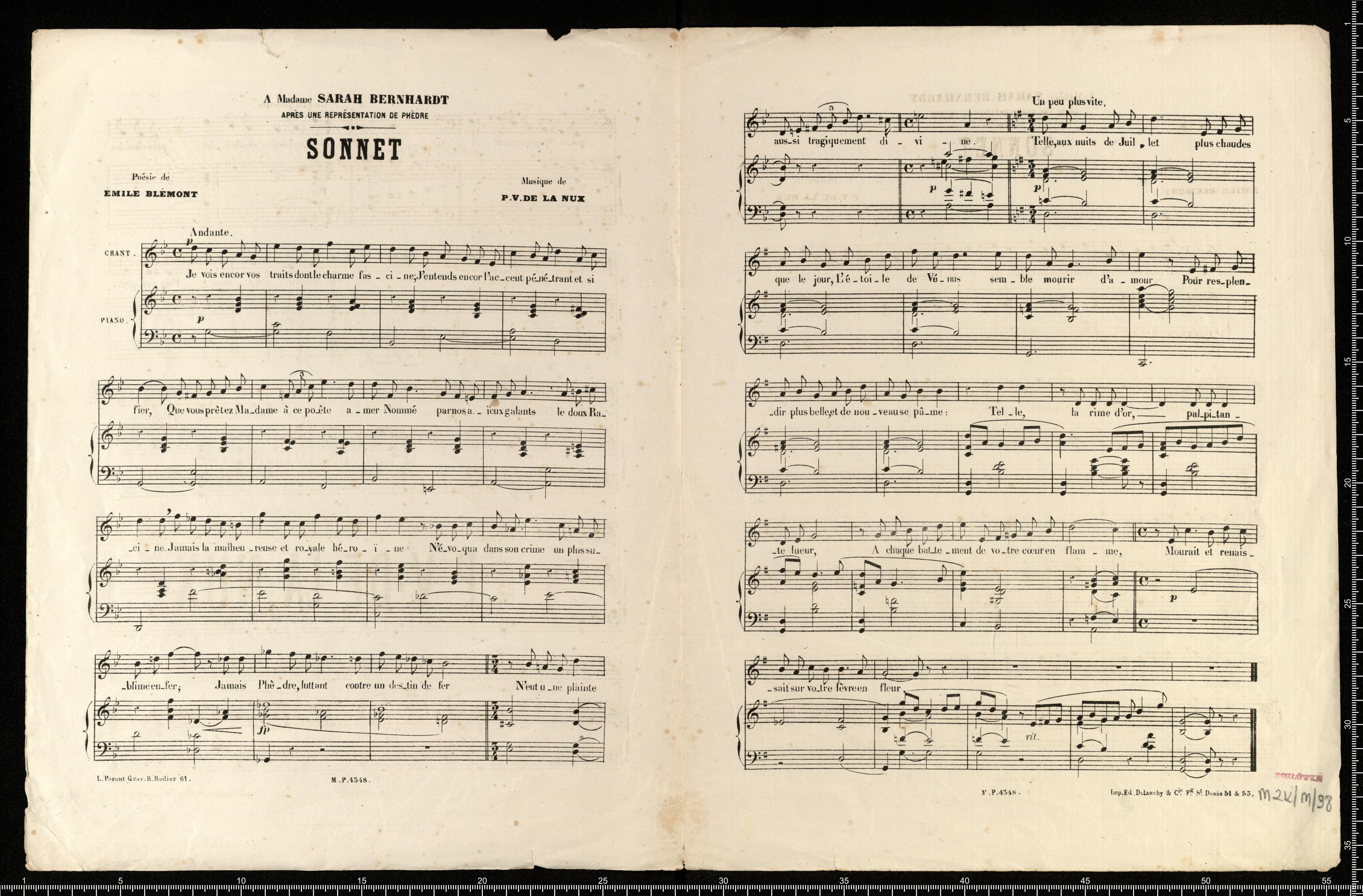 à Madame Sarah Bernhardt | aprés une Représentation de PHÈDRE | Sonnet | d'Émile Blément | Musique de | P.V. DE LA NUX | Prix: 3. | AUX BUREAUX DE L'ARTISTE | 16, rue de la Grange-Batelière