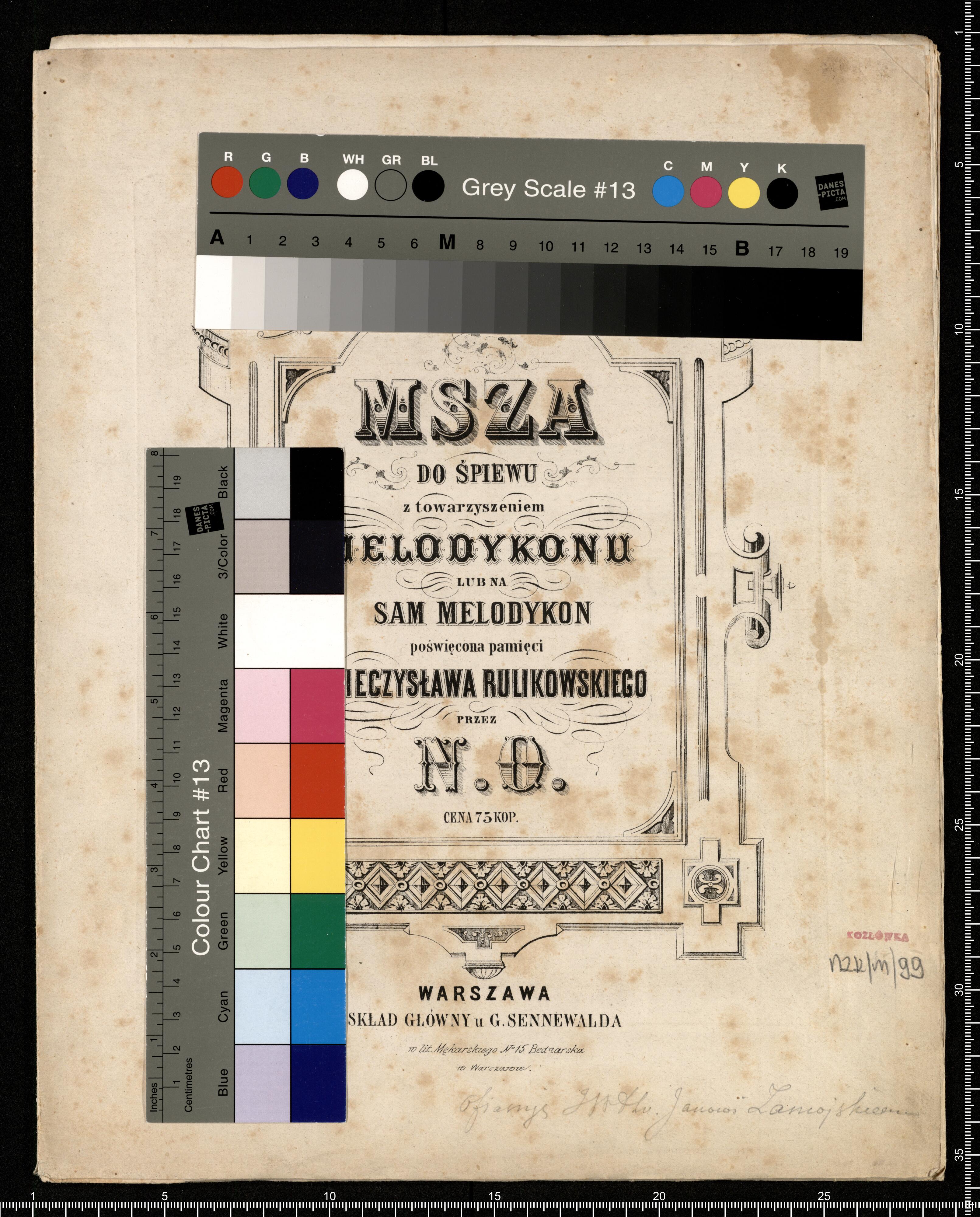 MSZA | DO ŚPIEWU | z towarzyszeniem | MELODYKONU | LUB NA | SAM MELODYKON | poświęcona pamięci | MIECZYSŁAWA RULIKOWSKIEGO | PRZEZ | N.O. | CENA 75 KOP. | WARSZAWA | SKŁAD GŁÓWNY u G. SENNEWALDA | ro lit. Mękarskiego N° 15 Bednarska | w Warszawie