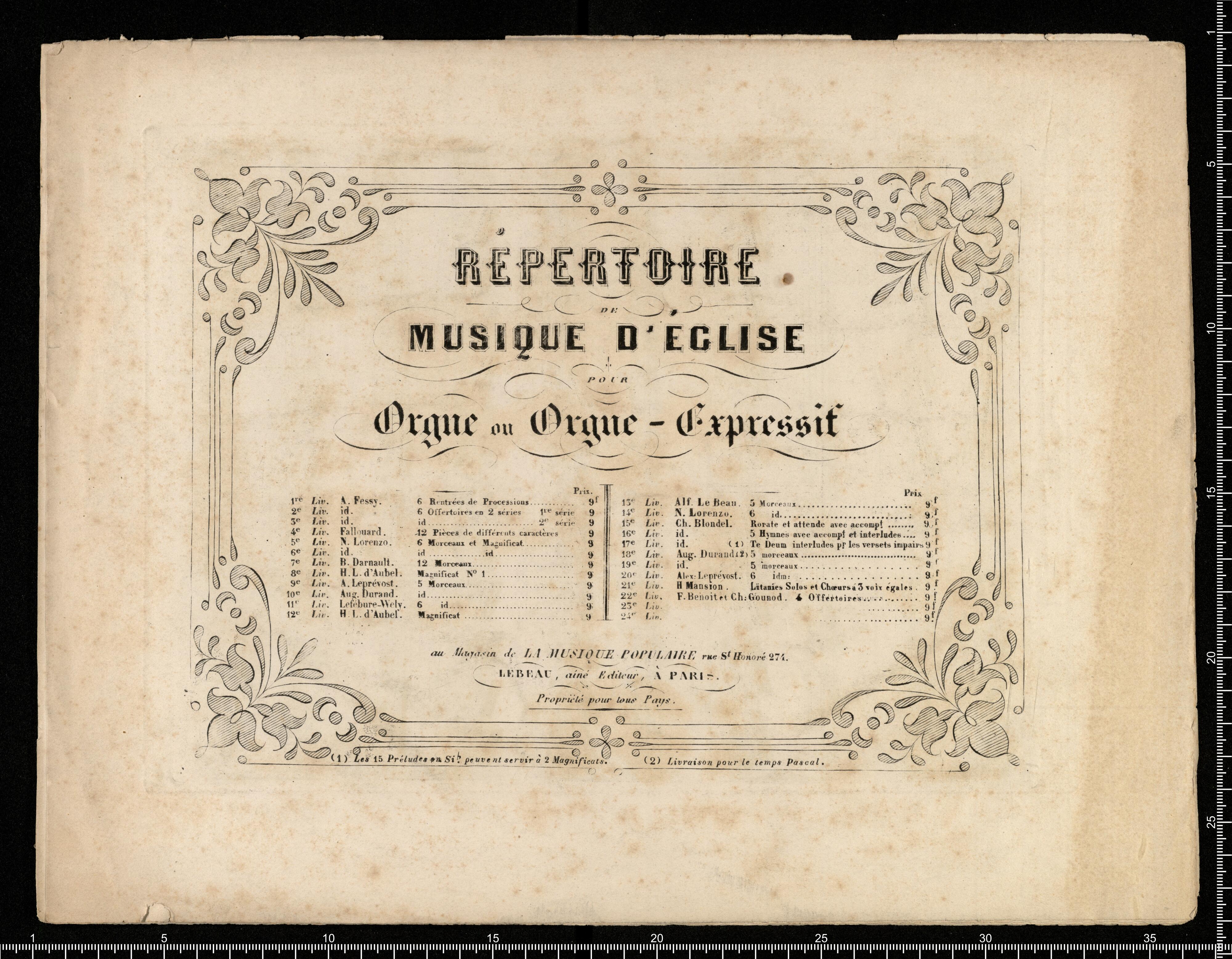 [1st title page:] № 3 | hymne | à | S.|t|e CECILE | MEDITATION | RELIGIEUSE | CHARLES GOUNOD | [right side:] SOLO DE VIOLON | 1. Acc. de Harpes Timpalles Inst a Vent & C. Basses 24.|f | Orgue Piano et Violon... 9. | Piano et Violon de A.HERMANN.. 7. 50. [right side:] TRANSCRIPTIONS | 2. Piano Edition Originale p.|r CH. DE BERIOT fils .6.|f | 4. ,, Edition Simplifiée p.|r W. GOLDNER.. 4. | 6. Orgue & Piano p.|r AL. LE BEAU..7.50. | PARIS | Au Magasin de la MUSIQUE POPULAIRE. | LEBEAU Ainé Éditeur Rue S.|t Honoré. №274. | Près l'Église S.|t Roch, Maison des Bains | Proprieté pour tous pays. Déposé selon les traités | A. CORNE.Graveur