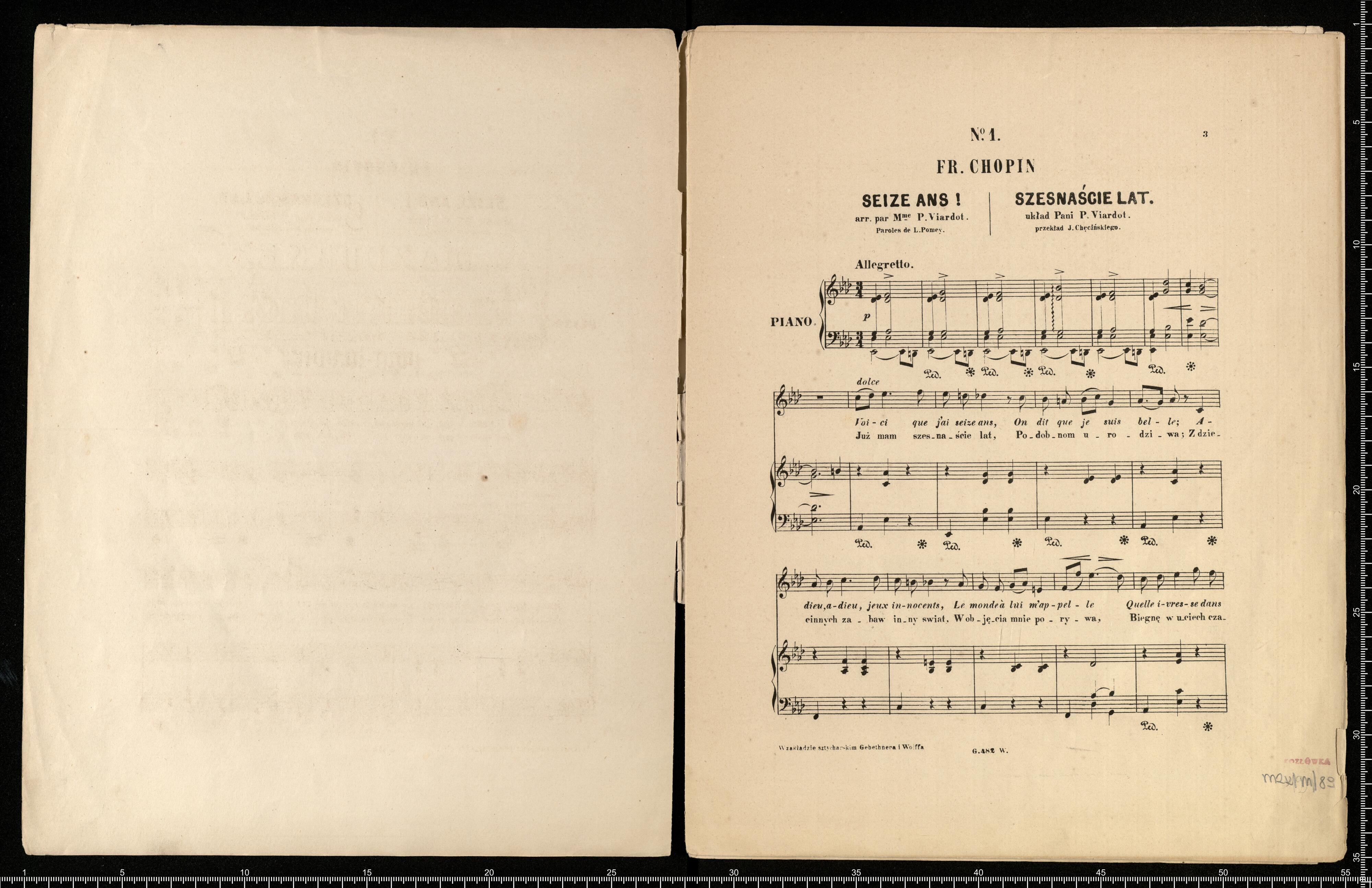 6 | MAZOURKES | DE | FRÉDÉRIC CHOPIN | arrangées | pour la voir | par | Mme Pauline Viardot. | Paroles français de L. Pomey | Traduction polonaise de J. Chęciński. | VARSOVIE, | chez GEBETHNER & WOLFF | LEIPZIG, D. H. GEISSLER | G. 482 - 487.W