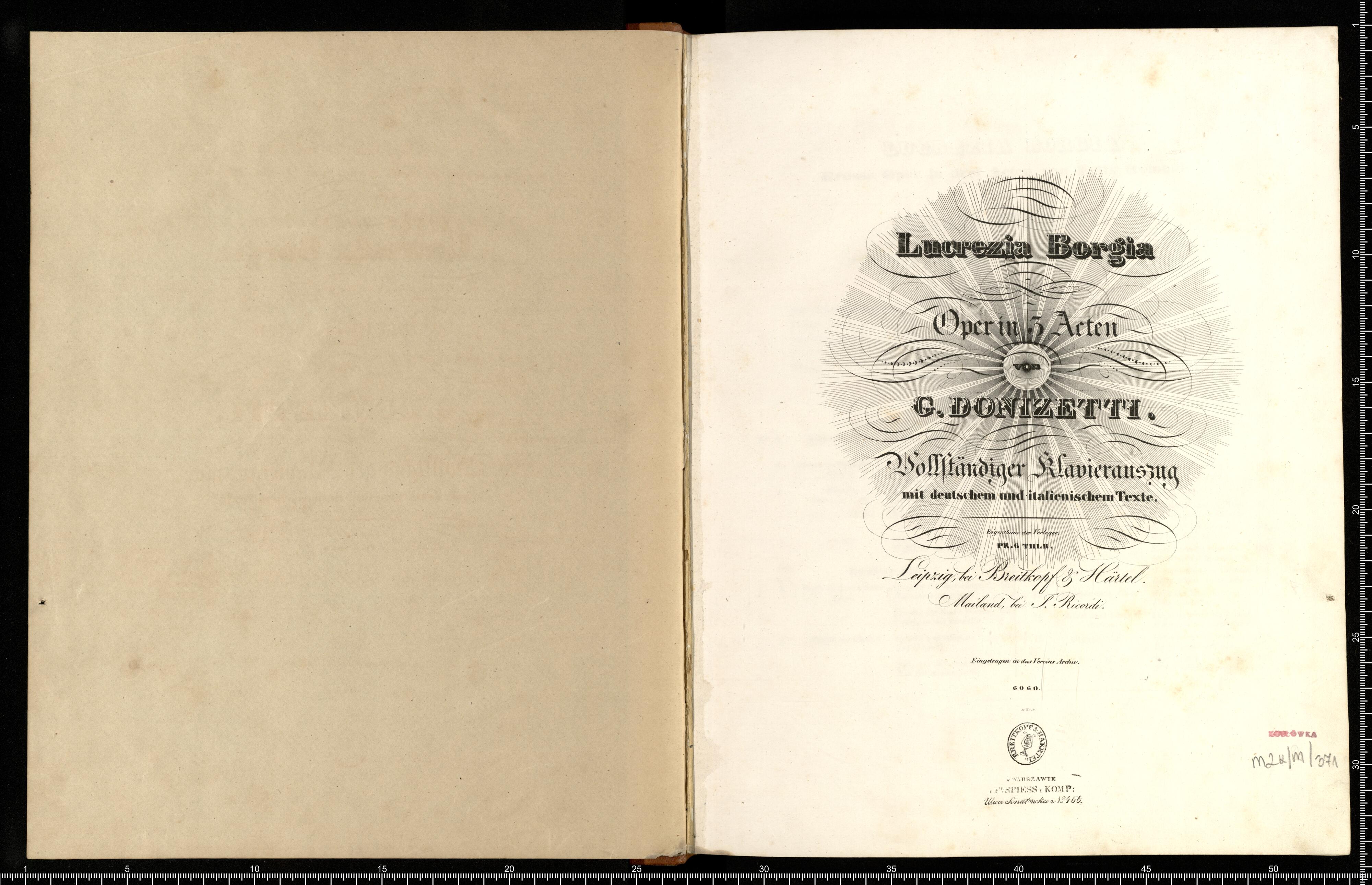 Lucrezia Borgia | Oper in 3 Acten | von | G. DONIZETTI. | Vollständiger Klavierauszug | mit deutschem und italienischem Texte. | Eigenthum der Verleger. | PR. 6 THLR. | Leipzig, bei Breitkopf & Härtel. | Mailand, bei J. Ricordi. | Eingetragen in das Vereins Archiv. | 6060 | Fr. Kr _ r