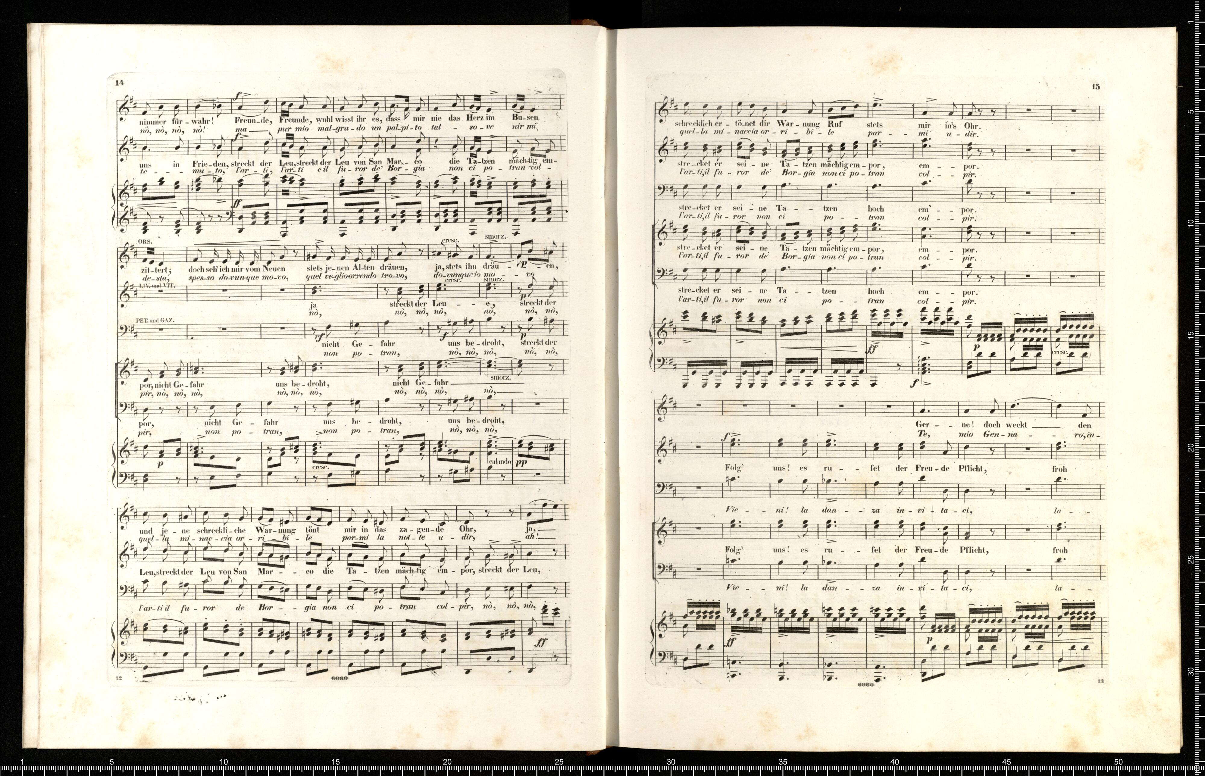 Lucrezia Borgia | Oper in 3 Acten | von | G. DONIZETTI. | Vollständiger Klavierauszug | mit deutschem und italienischem Texte. | Eigenthum der Verleger. | PR. 6 THLR. | Leipzig, bei Breitkopf & Härtel. | Mailand, bei J. Ricordi. | Eingetragen in das Vereins Archiv. | 6060 | Fr. Kr _ r