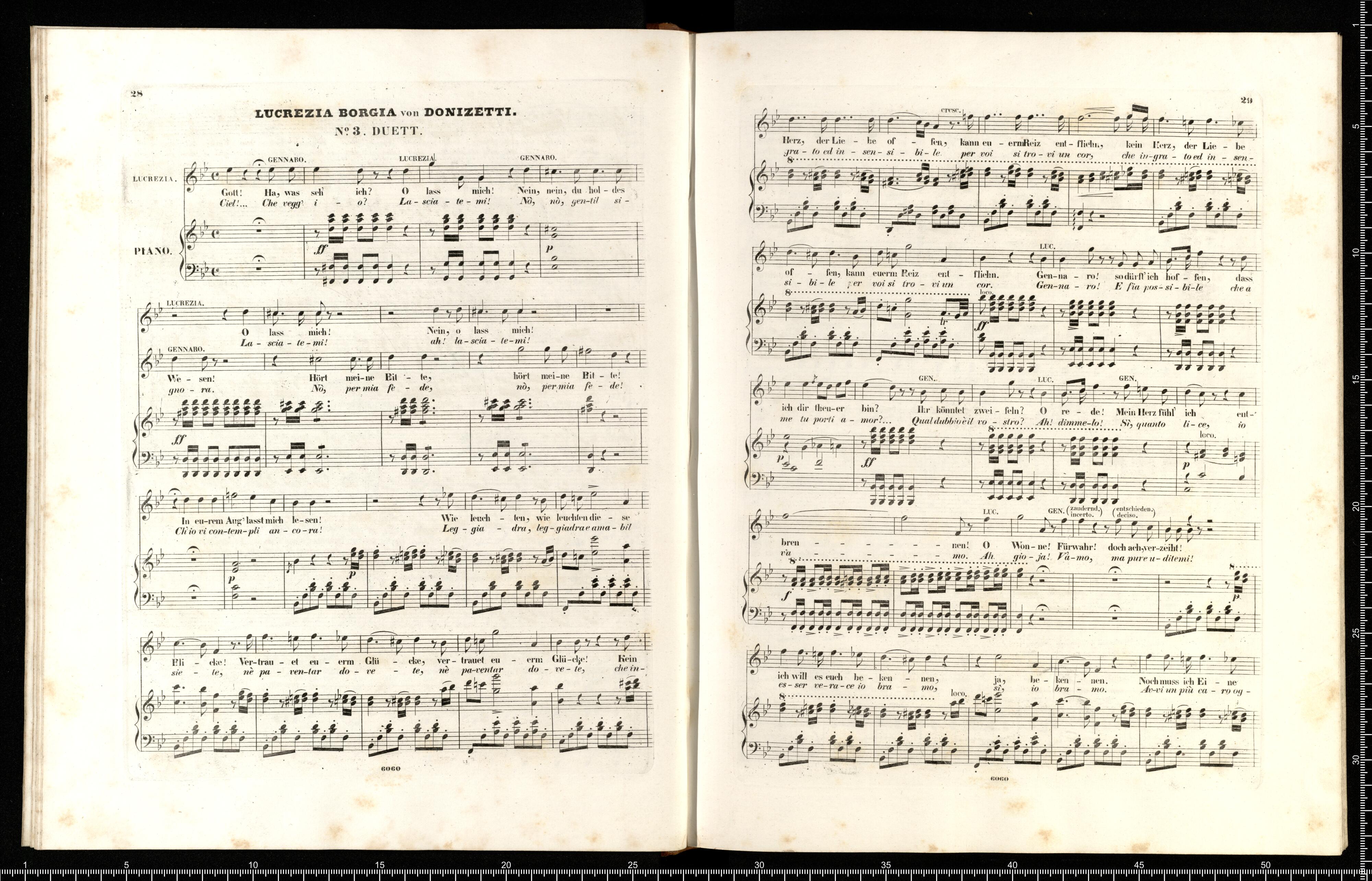 Lucrezia Borgia | Oper in 3 Acten | von | G. DONIZETTI. | Vollständiger Klavierauszug | mit deutschem und italienischem Texte. | Eigenthum der Verleger. | PR. 6 THLR. | Leipzig, bei Breitkopf & Härtel. | Mailand, bei J. Ricordi. | Eingetragen in das Vereins Archiv. | 6060 | Fr. Kr _ r