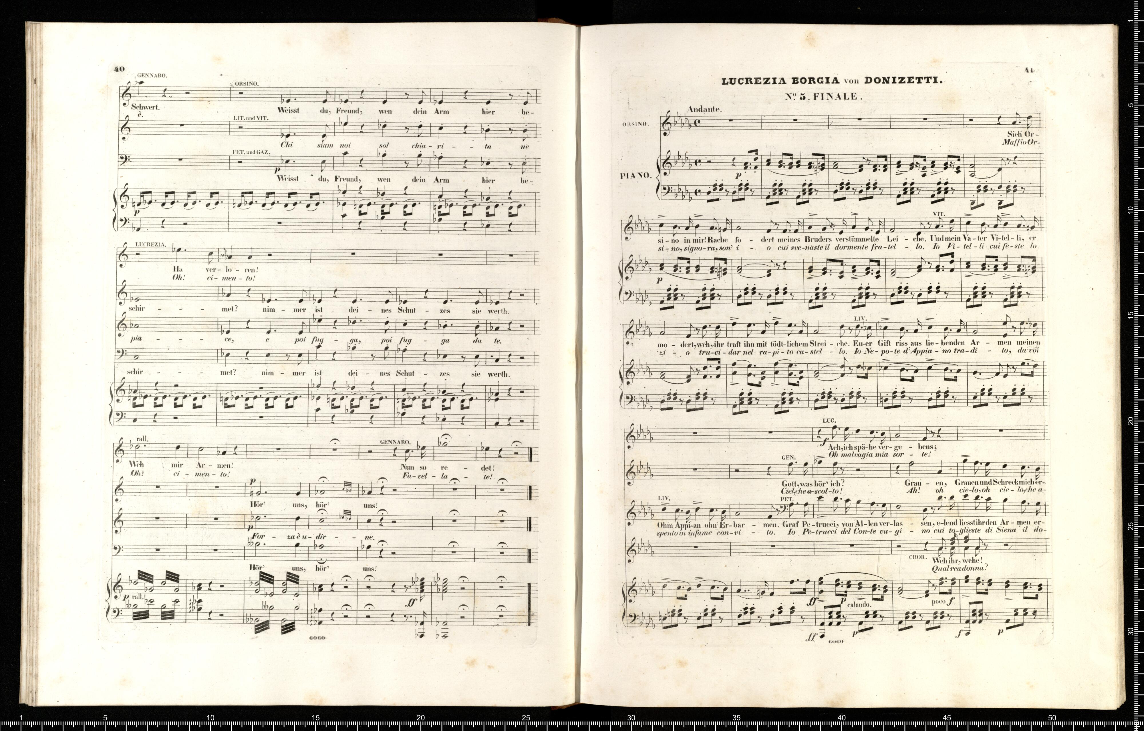 Lucrezia Borgia | Oper in 3 Acten | von | G. DONIZETTI. | Vollständiger Klavierauszug | mit deutschem und italienischem Texte. | Eigenthum der Verleger. | PR. 6 THLR. | Leipzig, bei Breitkopf & Härtel. | Mailand, bei J. Ricordi. | Eingetragen in das Vereins Archiv. | 6060 | Fr. Kr _ r
