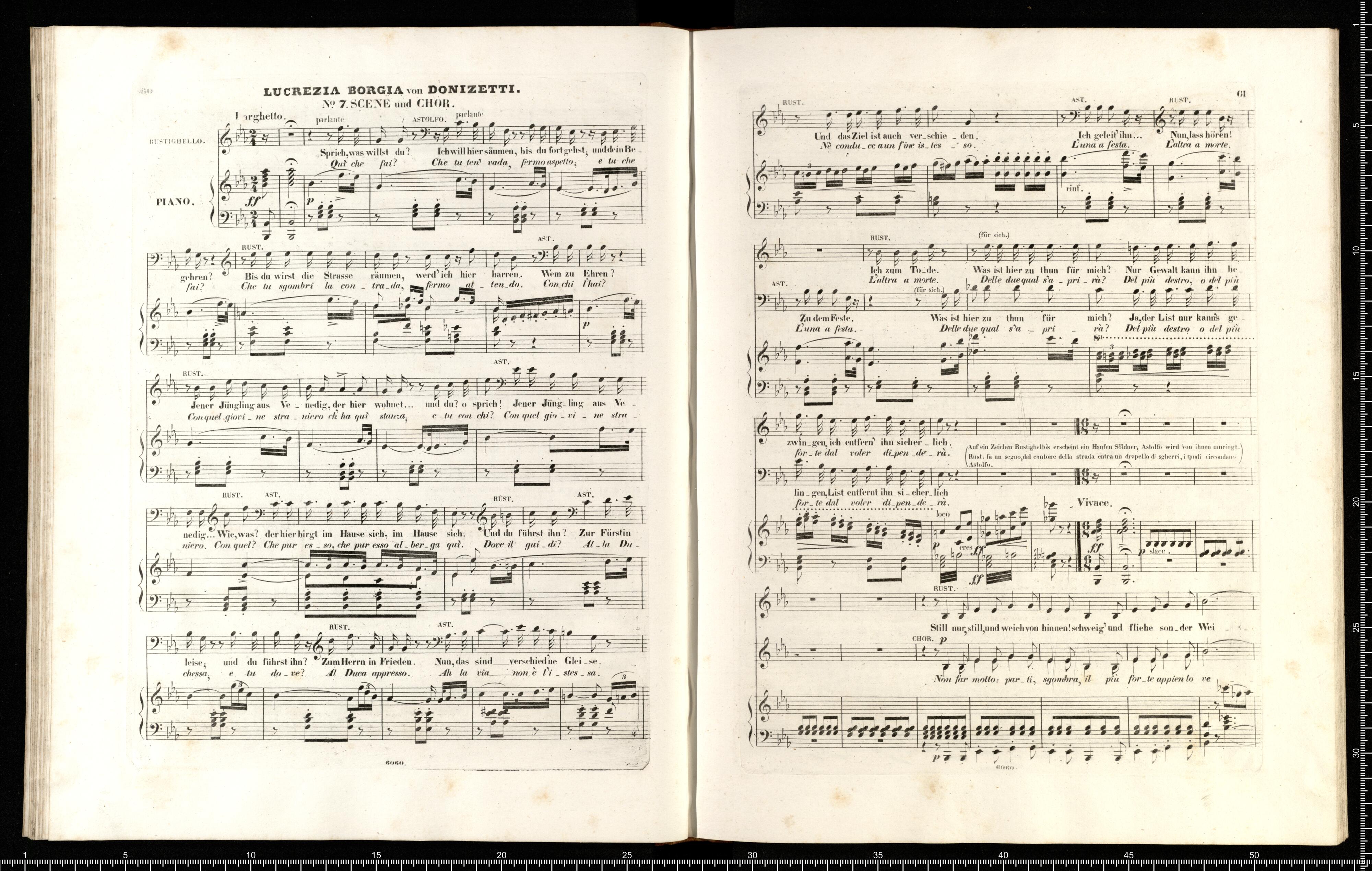 Lucrezia Borgia | Oper in 3 Acten | von | G. DONIZETTI. | Vollständiger Klavierauszug | mit deutschem und italienischem Texte. | Eigenthum der Verleger. | PR. 6 THLR. | Leipzig, bei Breitkopf & Härtel. | Mailand, bei J. Ricordi. | Eingetragen in das Vereins Archiv. | 6060 | Fr. Kr _ r