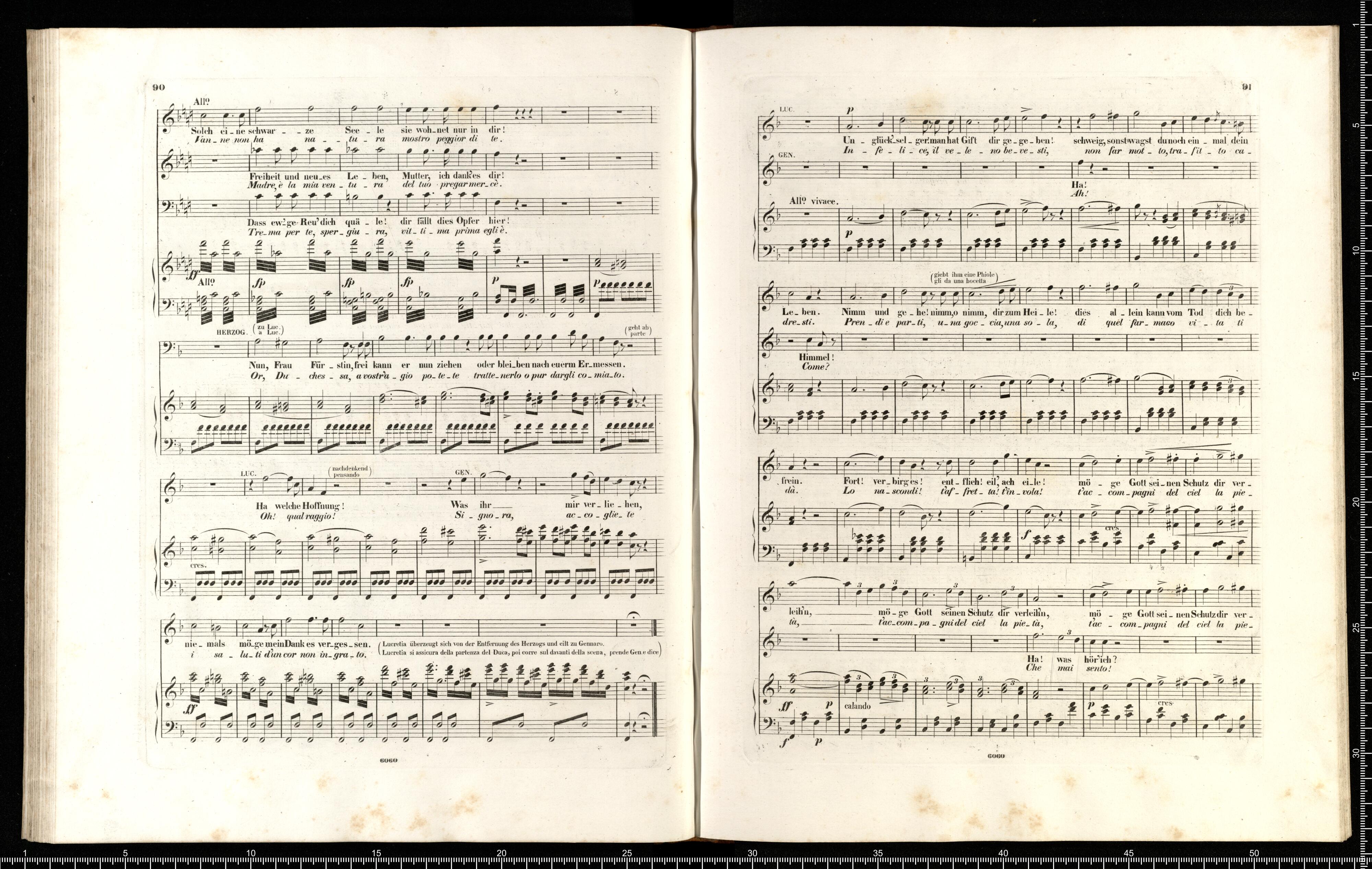 Lucrezia Borgia | Oper in 3 Acten | von | G. DONIZETTI. | Vollständiger Klavierauszug | mit deutschem und italienischem Texte. | Eigenthum der Verleger. | PR. 6 THLR. | Leipzig, bei Breitkopf & Härtel. | Mailand, bei J. Ricordi. | Eingetragen in das Vereins Archiv. | 6060 | Fr. Kr _ r