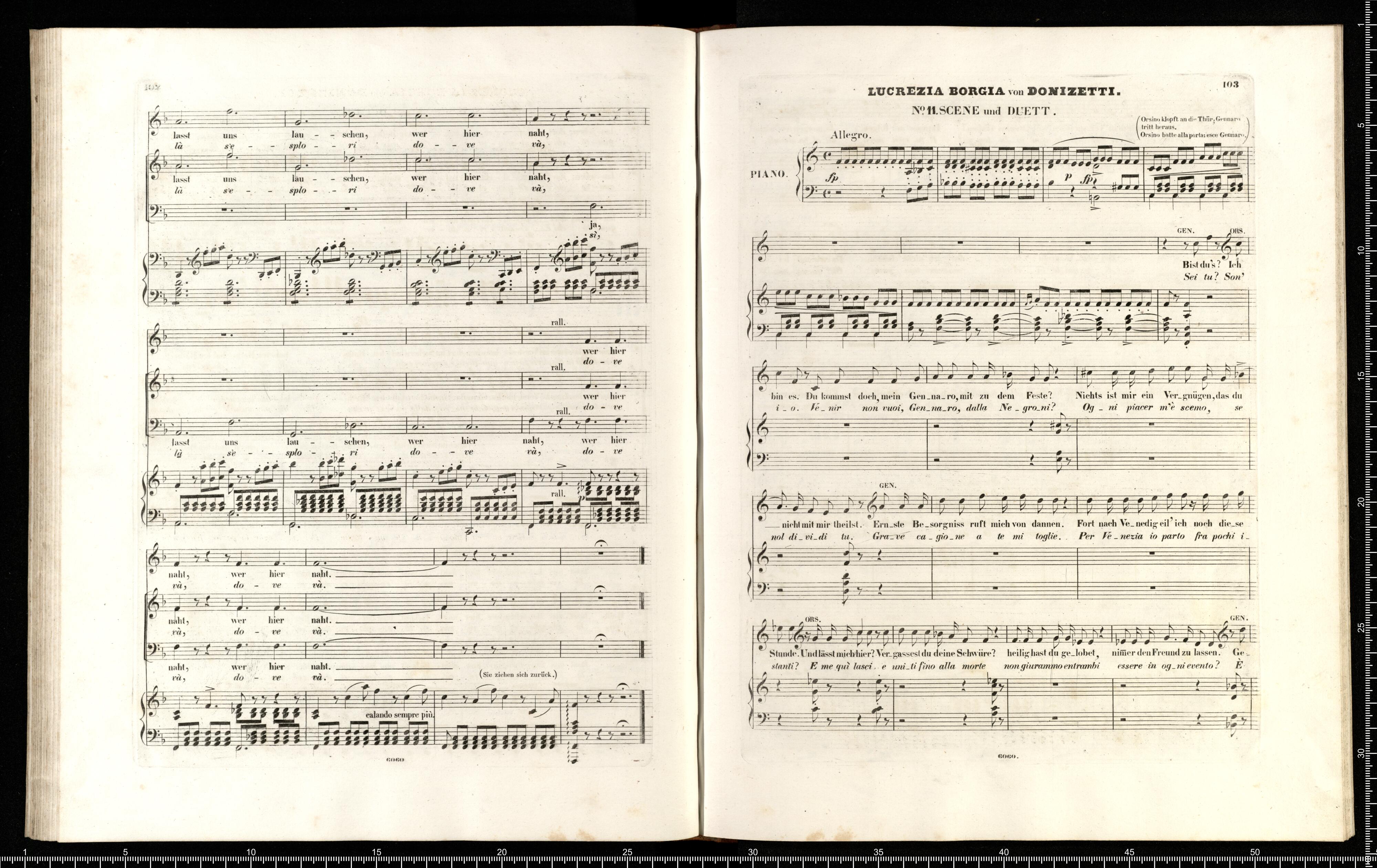 Lucrezia Borgia | Oper in 3 Acten | von | G. DONIZETTI. | Vollständiger Klavierauszug | mit deutschem und italienischem Texte. | Eigenthum der Verleger. | PR. 6 THLR. | Leipzig, bei Breitkopf & Härtel. | Mailand, bei J. Ricordi. | Eingetragen in das Vereins Archiv. | 6060 | Fr. Kr _ r