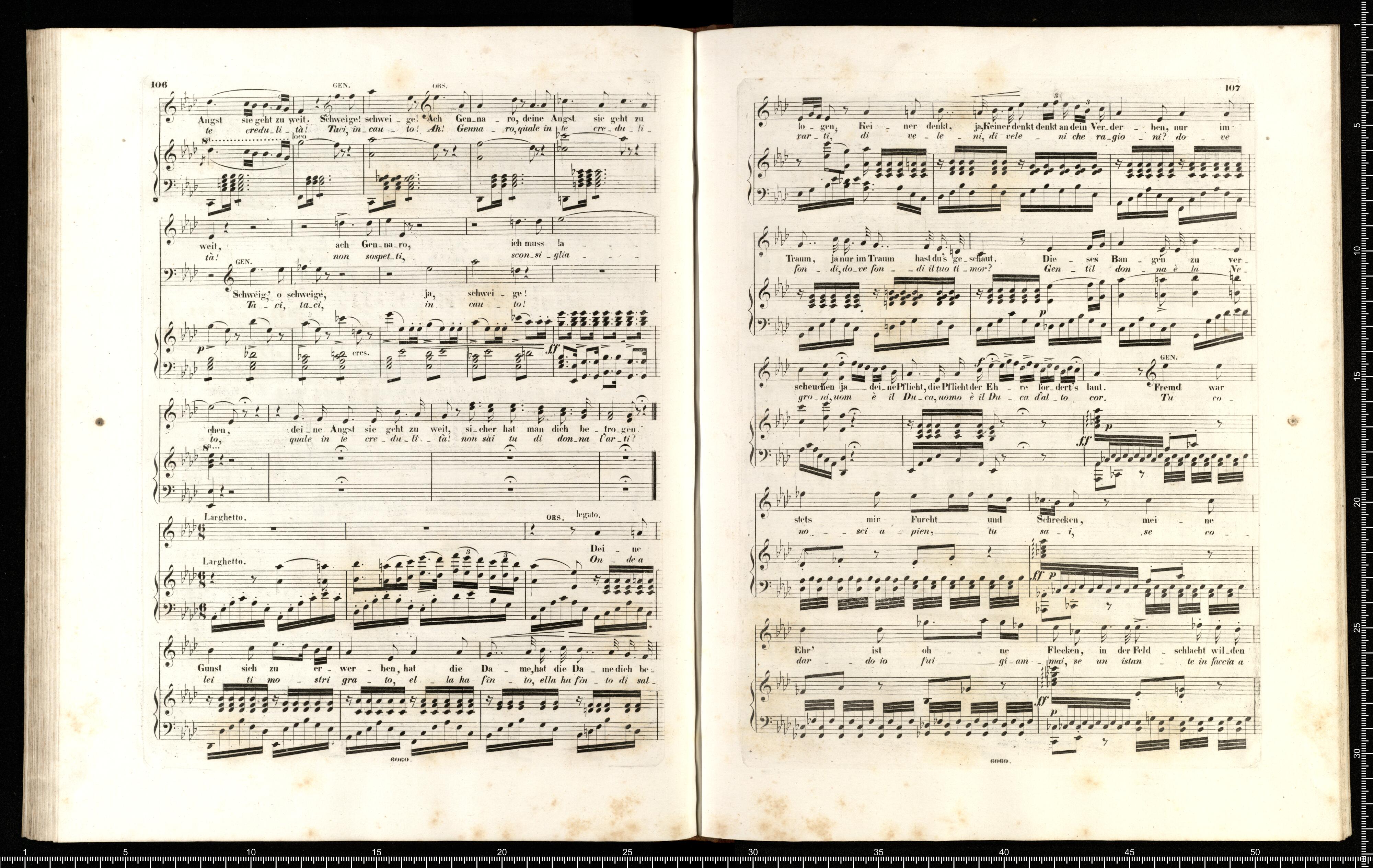 Lucrezia Borgia | Oper in 3 Acten | von | G. DONIZETTI. | Vollständiger Klavierauszug | mit deutschem und italienischem Texte. | Eigenthum der Verleger. | PR. 6 THLR. | Leipzig, bei Breitkopf & Härtel. | Mailand, bei J. Ricordi. | Eingetragen in das Vereins Archiv. | 6060 | Fr. Kr _ r