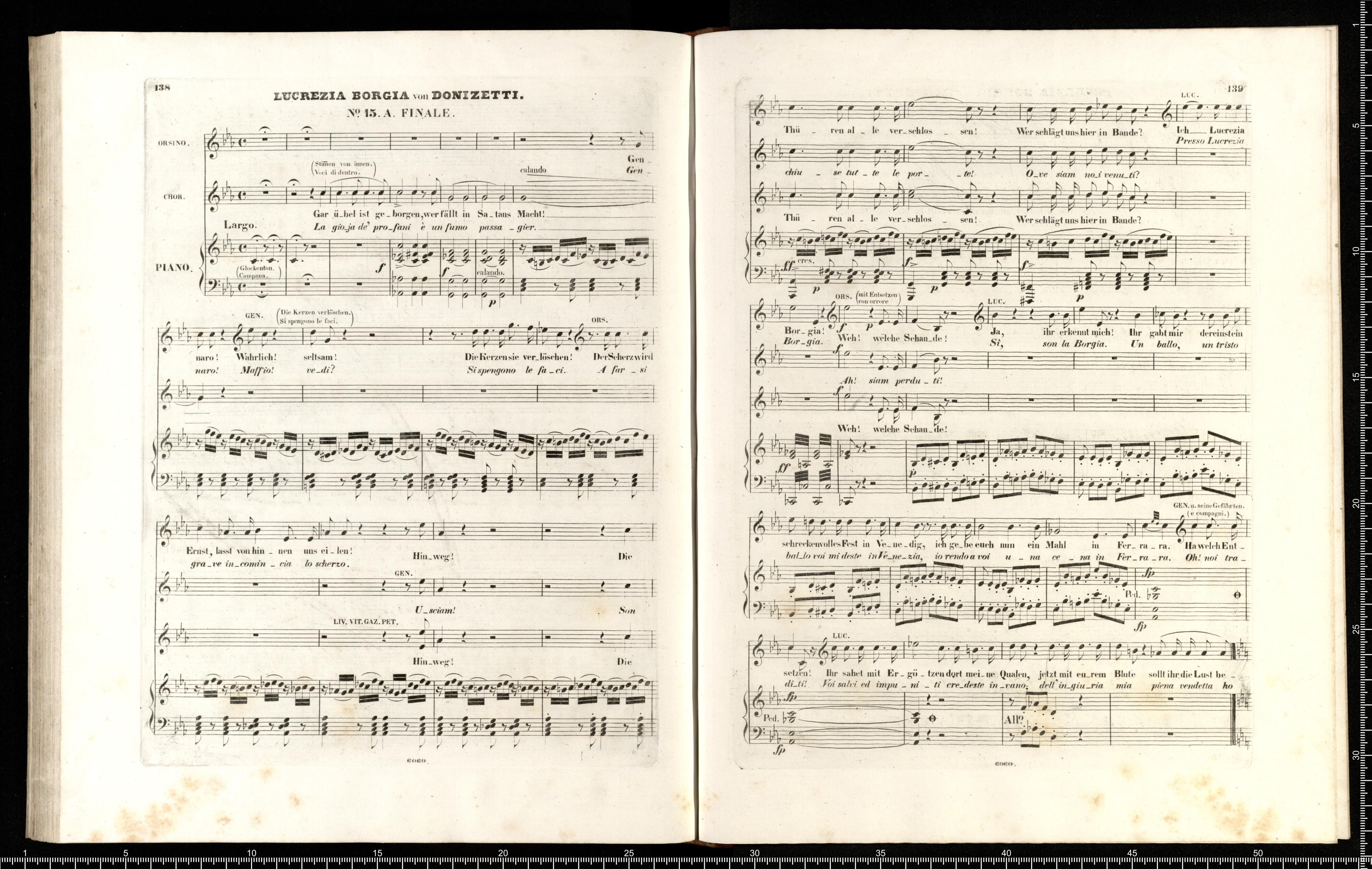 Lucrezia Borgia | Oper in 3 Acten | von | G. DONIZETTI. | Vollständiger Klavierauszug | mit deutschem und italienischem Texte. | Eigenthum der Verleger. | PR. 6 THLR. | Leipzig, bei Breitkopf & Härtel. | Mailand, bei J. Ricordi. | Eingetragen in das Vereins Archiv. | 6060 | Fr. Kr _ r