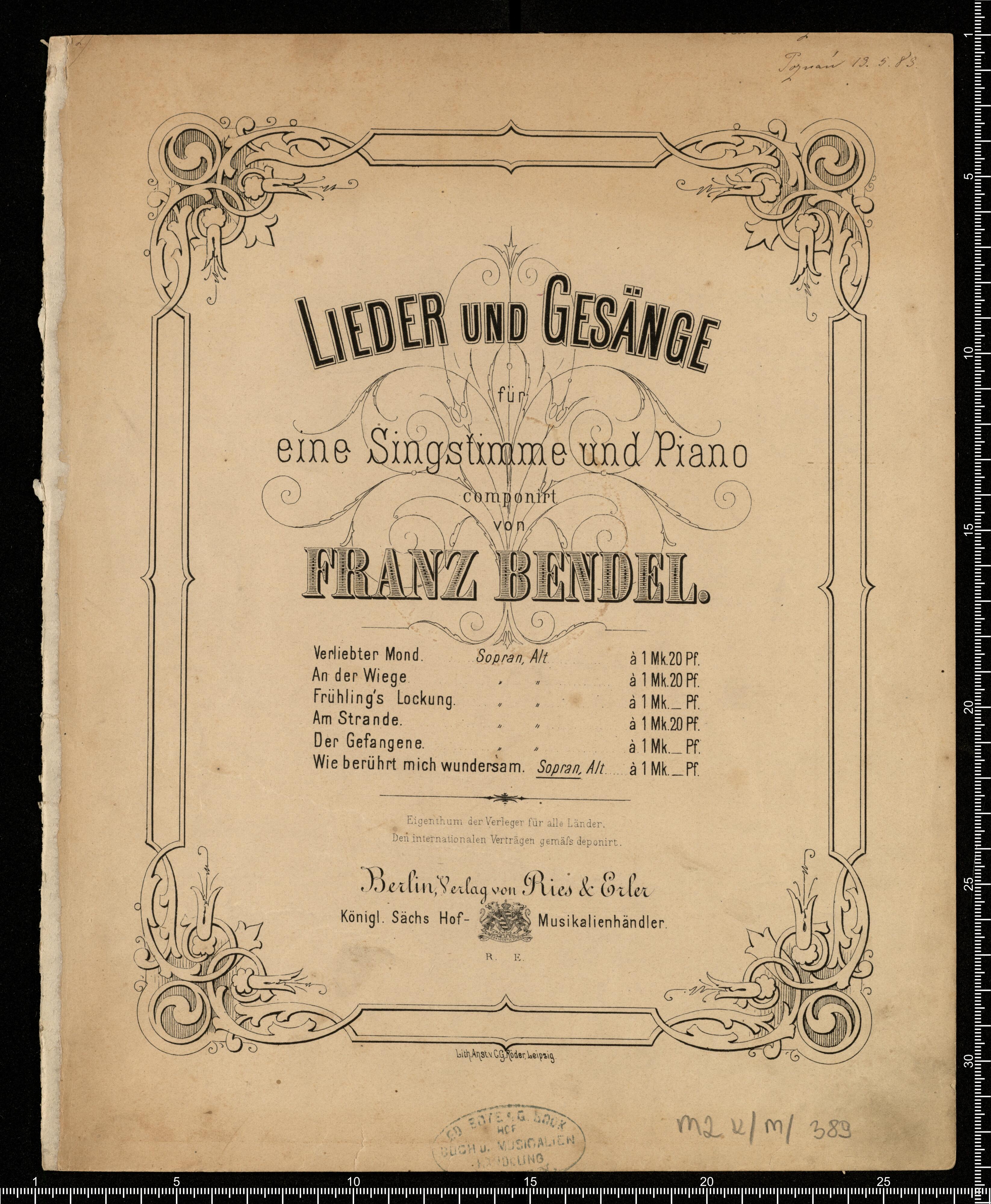 LIEDER UND GESÄNGE | für | eine Singstimme und piano | componirt von | FRANZ BENDEL. | [list of works] | Eigenthum der vreleger für alle Länder. | Den internationanalen Veträgen gemäss deponirt. | Berlin, Verlag von Ries & Erler | König. Sächs Hof-Musikalienhändler. | R. E. | Lith.Anst.v.C.G.Röder, Leipzig