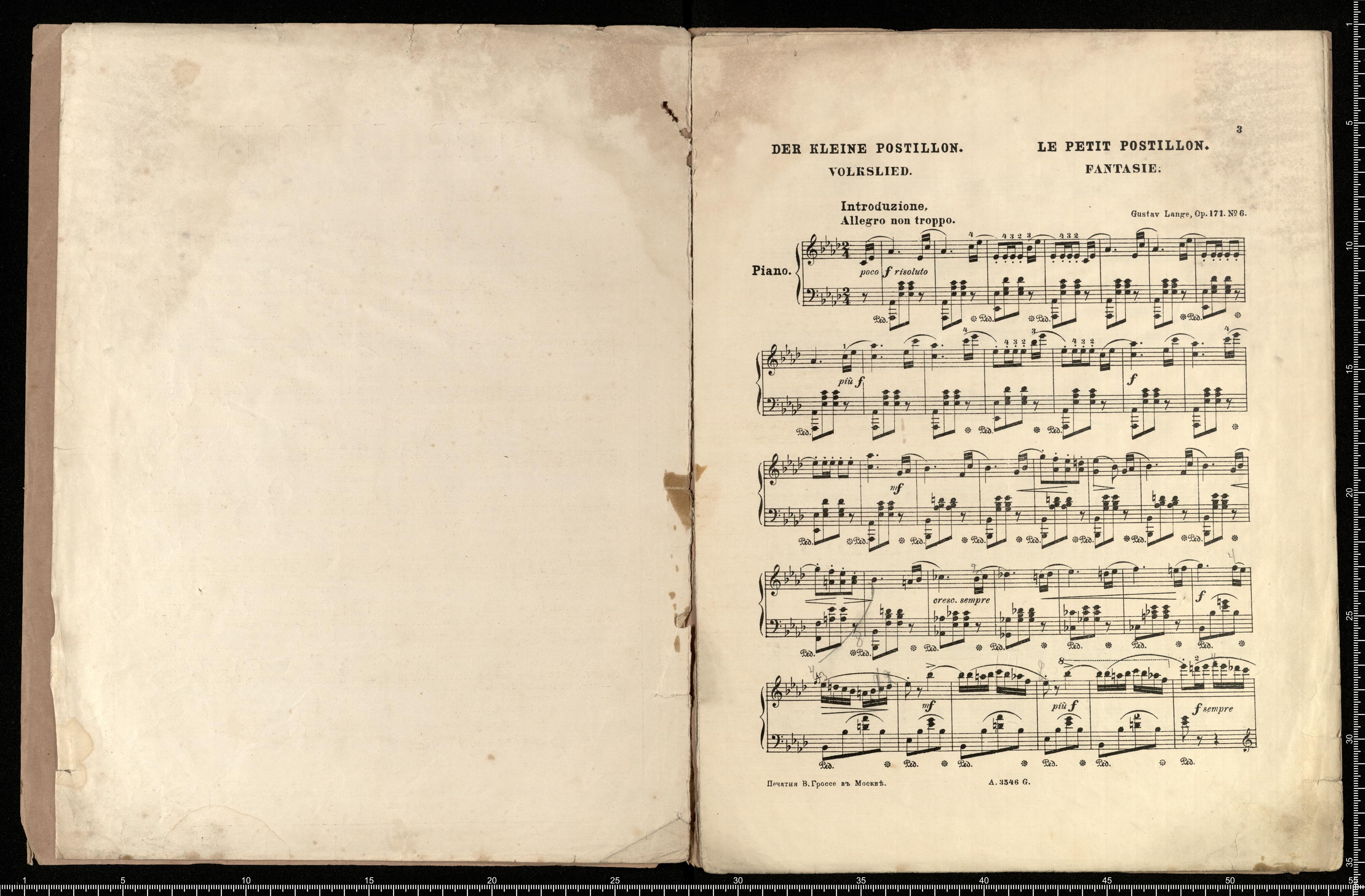 COMPOSITIONS |MODERNES ET BRILLANTES | POUR LE PIANO | 3|m|e SUITE. | [list of compositions in two column] | Moscou chez A. Gutheil | Founisseur de la cour IMPÉRIALE et des Theatres Impériaux, | au Pont des Marechaux, 16. | St-Petersbourg, chez A. Johanses. Perspective de Nevsky N|o 63 Kieff, chez L. Jdzikowsky. | Varsovie, chez Gebethner & Wolff