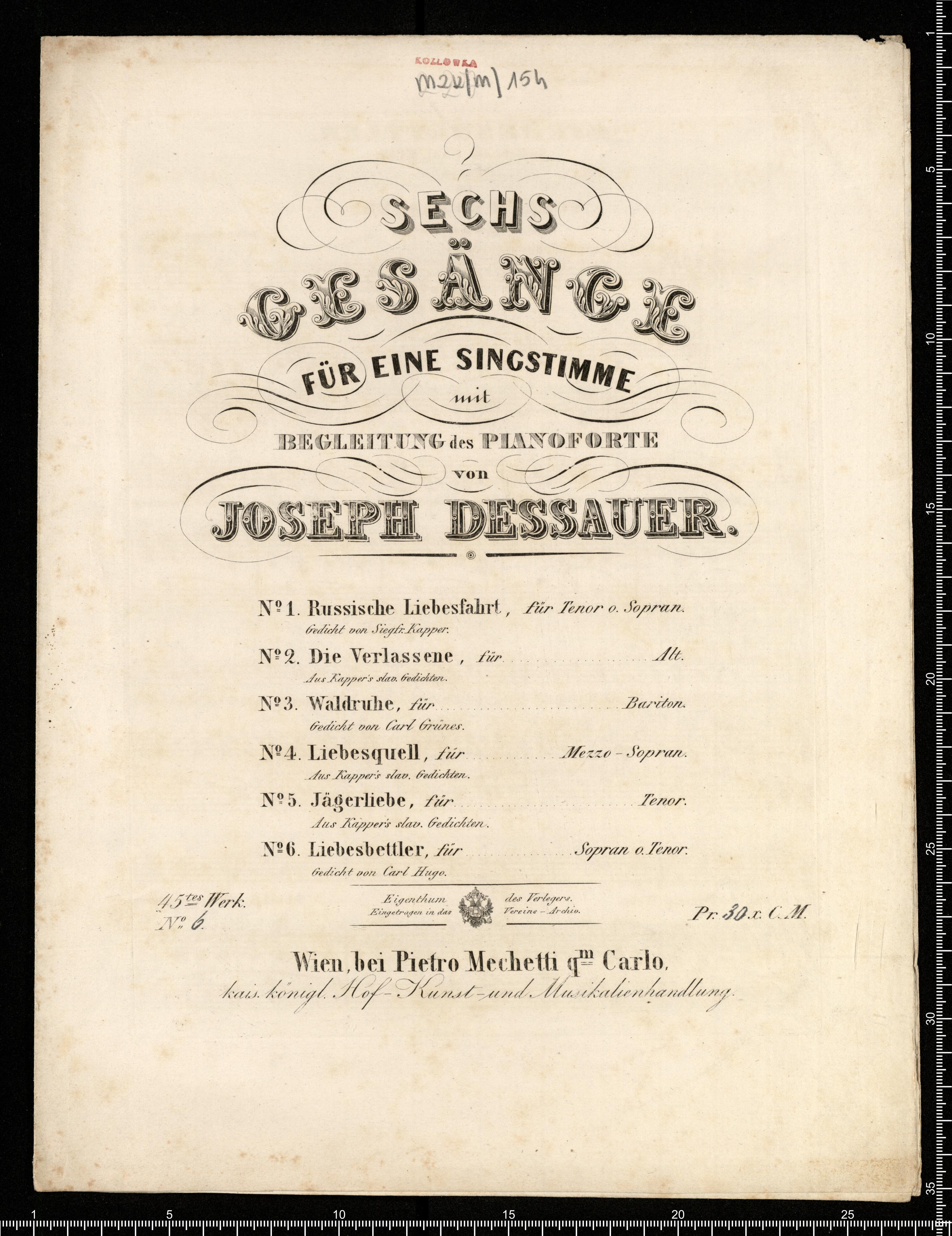 SECHS | GESÄNGE | FÜR EINE SINGSTIMME | mit | BEGLEITUNG des PIANOFORTE | von | JOSEPH DESSAUER. | 45(tes) Werk. N° 6. Eigenthum des Verlegers. | Eingetragen in das Vereine-Archiv. Pr. 30 x C.M. | Wien, bei Pietro Mechetti q(m) Carlo, | kais. königl. Hof-Kunst-und Musikalienhandlung