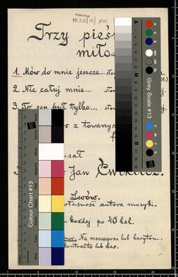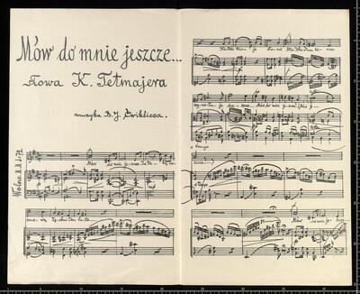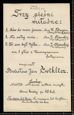 Trzy pieśni | miłosne: | 1. Mów do mnie jeszcze... słowa K. Tetmajera. | (Poezyje W. 1898 II, str. 201.) | na 1 głos z towarzyszeniem | fortepianu | napisał | Bolesław Jan Ćwiklicz. | Lwów. | Nakład własność autora muzyki. | Cena każdej po 40 hal. | Na sopran lub tenor, Mów do mnie jeszcze V, pf e