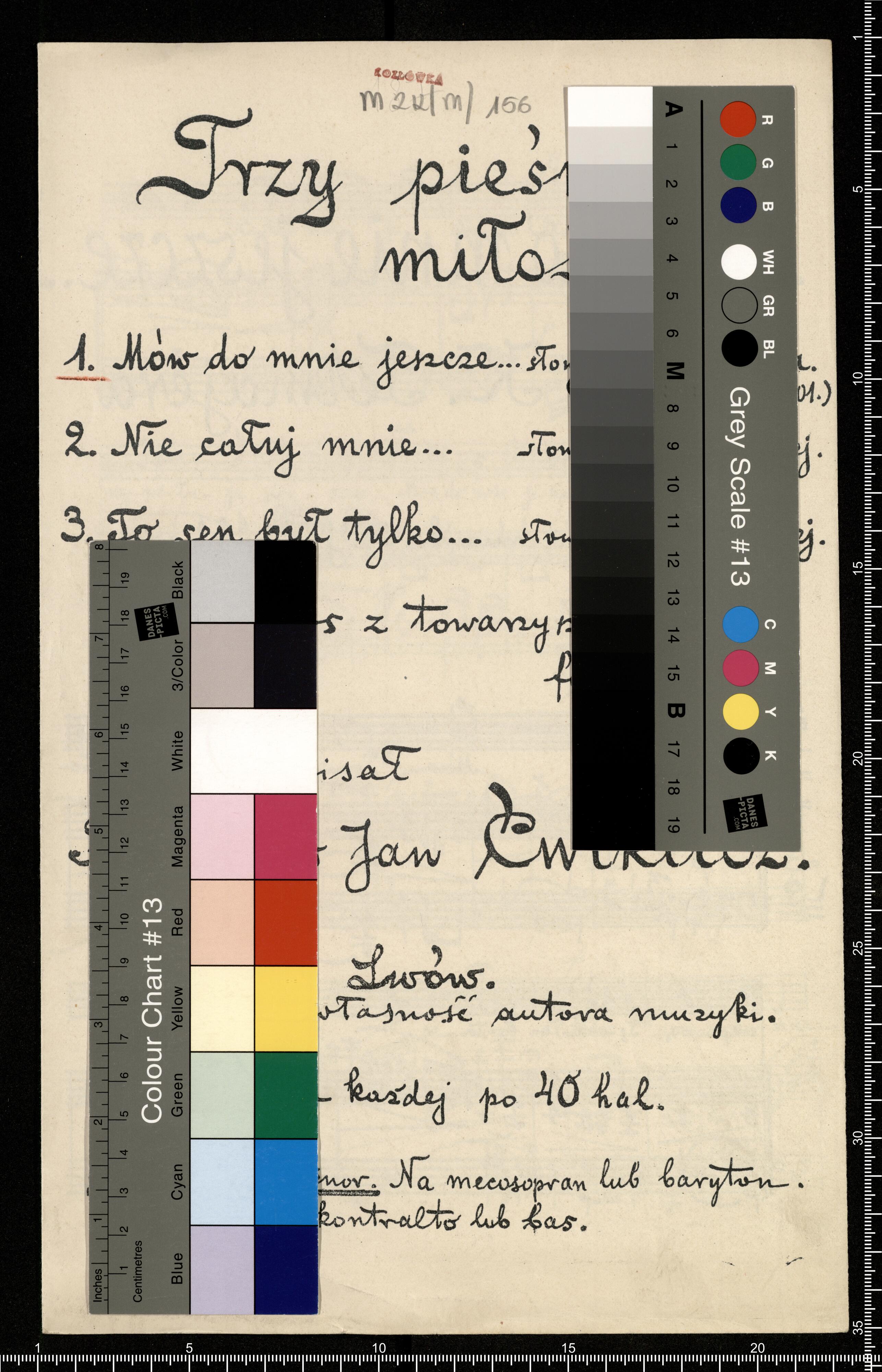 Trzy pieśni | miłosne: | 1. Mów do mnie jeszcze... słowa K. Tetmajera. | (Poezyje W. 1898 II, str. 201.) | na 1 głos z towarzyszeniem | fortepianu | napisał | Bolesław Jan Ćwiklicz. | Lwów. | Nakład własność autora muzyki. | Cena każdej po 40 hal. | Na sopran lub tenor