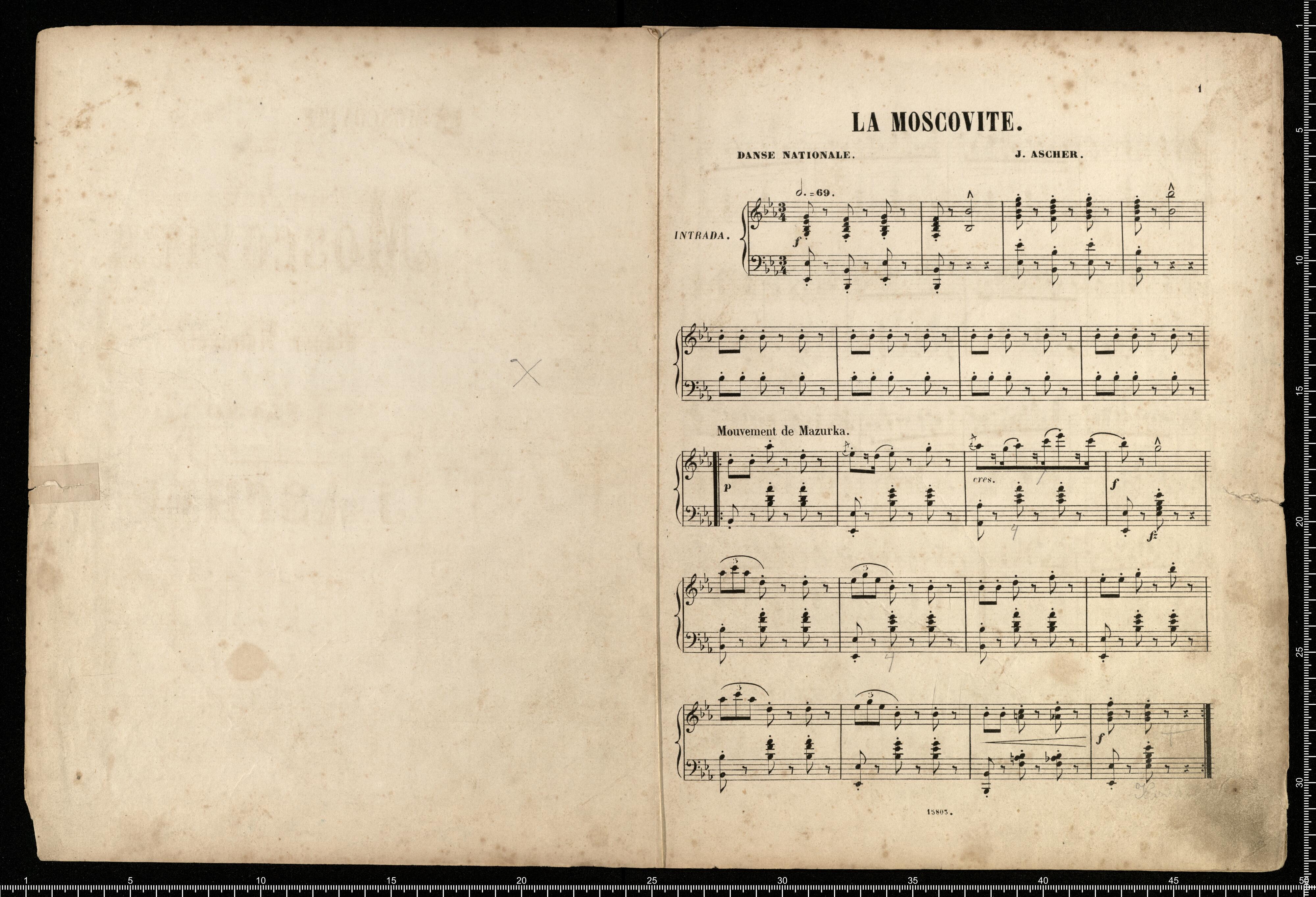 à son ami le Prince | Serge Ouchtomsky. | LA | Moscovite | Danse Nationale | pour | PIANO | par | J. ASCHER | Pr. 54 Kr. | Propriété des Editeurs. Enregistré aux Archives de l'Union. | MAYENCE | chez les fils de B. Schott | Bruxelles chez Schott frères Londres Schott & C|i|e | 82 Montagne de la Cour 159. Regent Street. | Dépôt général de notre fonds de Musique: | LEIPZIG ROTTERDAM | C. F. Leede. W. F. Lichtenauer. | 15803