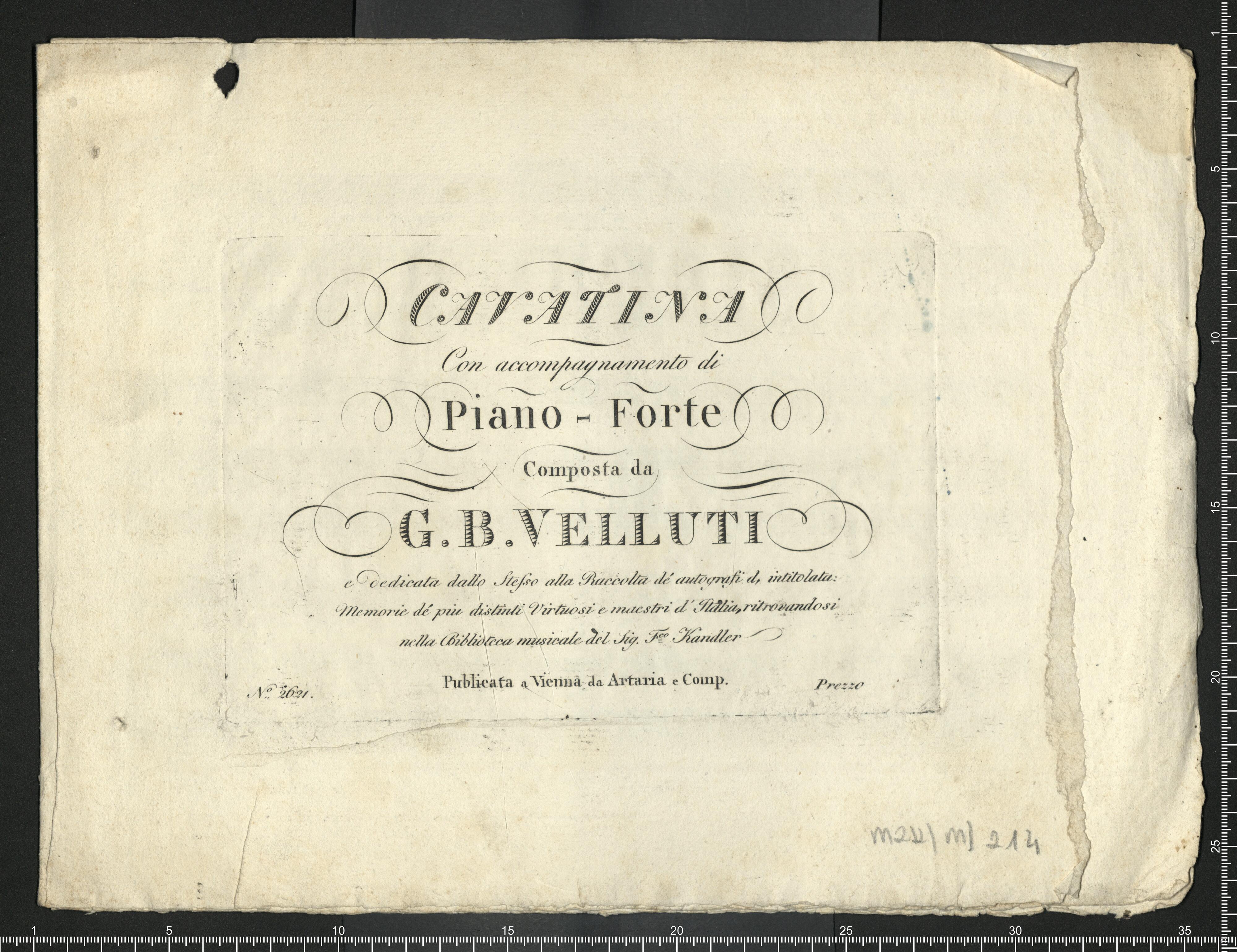 CAVATINA | Con accompagnamento di | Piano-Forte | Composta da | G. B. VELLUTI | e dedicata dallo Stesso alla Raccolta dé autografi d, intitolata: | memorie dé piu distinti virtuosi e maestei d'Italia, ritrovandosi | nella Biblioteca musicale del Sig. F|c|o Kandler | Publicata a Vienna da Artaria e Comp. | № 2621. Prezzo