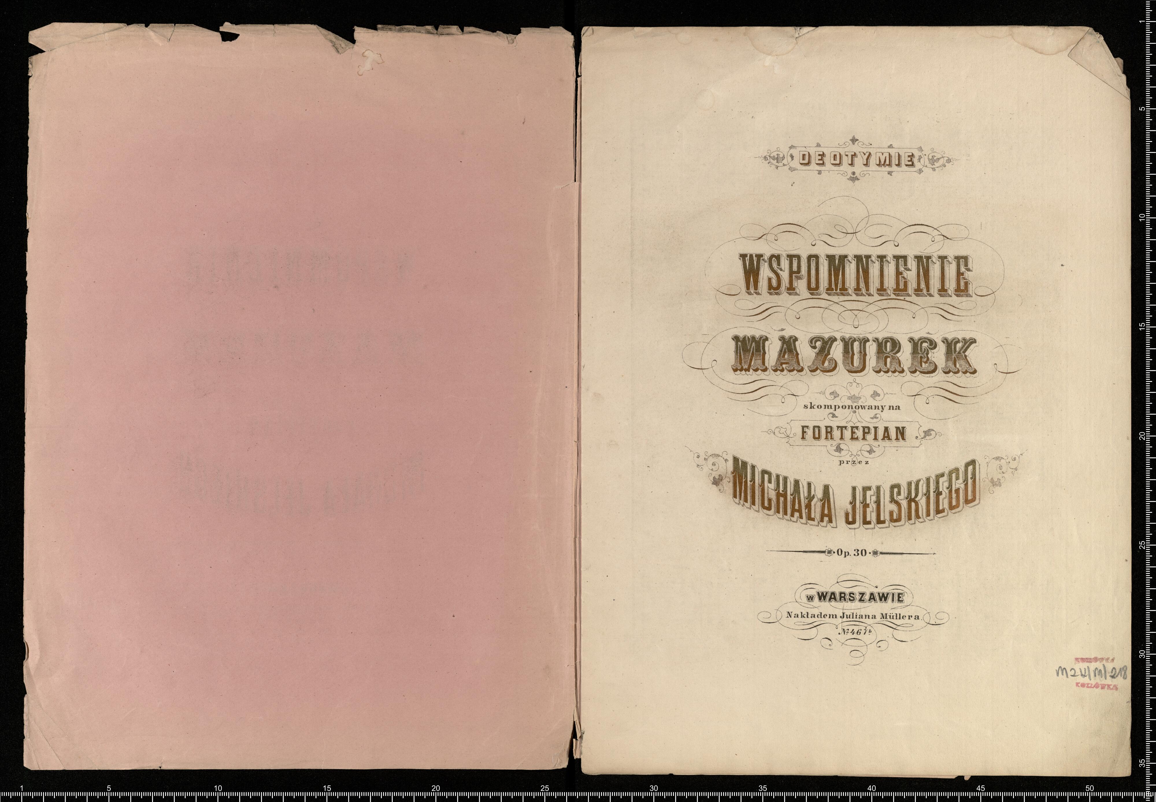 DEOTYMIE | WSPOMNIENIE | MAZUREK | skomponowany na | FORTEPIAN | przez | MICHAŁA JELSKIEGO | Op. 30 | w WARSZAWIE | Nakładem Juliana Müllera | № 467|b