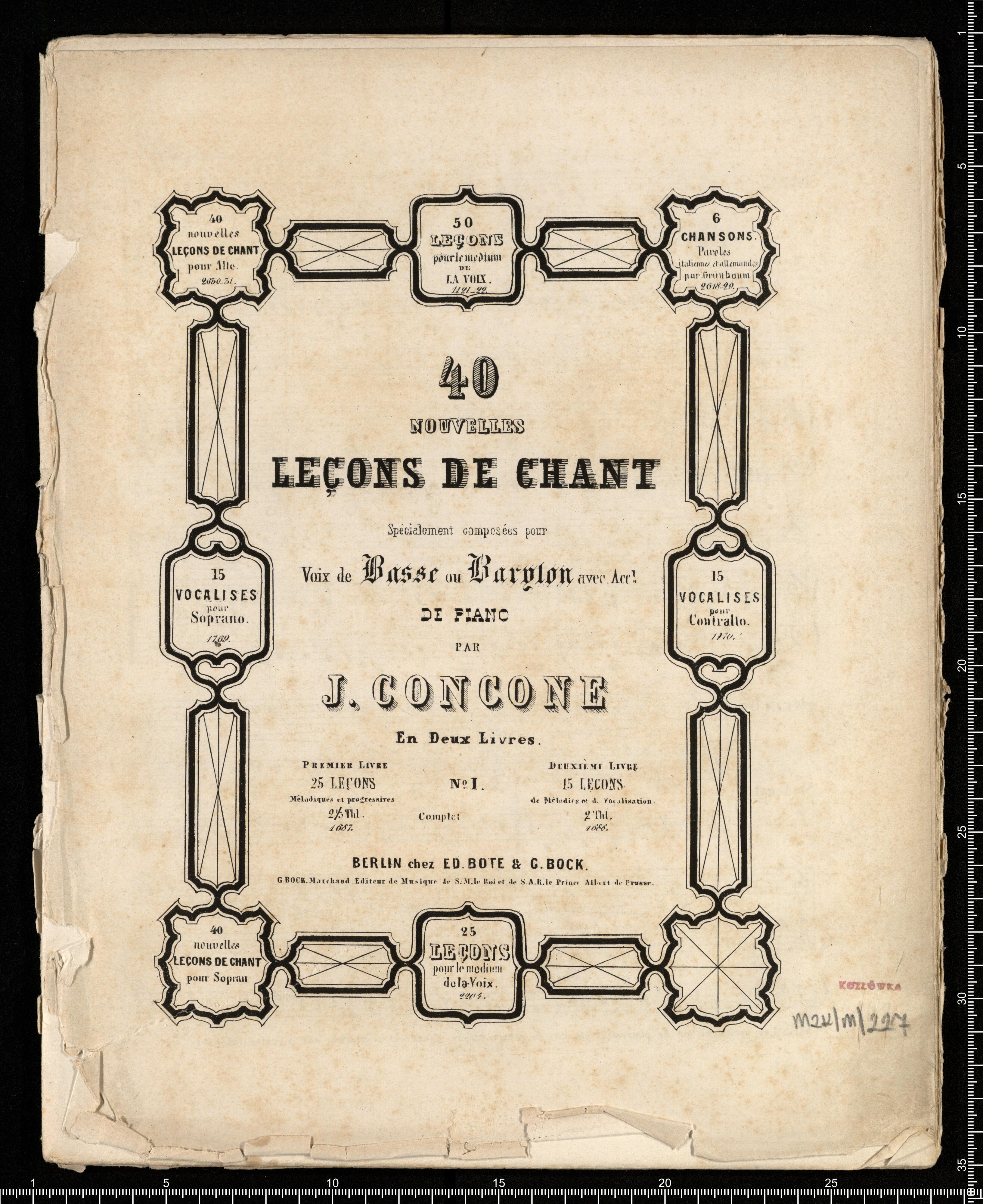40 | NOUVELLES | LEÇONS DE CHANT | Spécialement composées pour | Voix de Basse ou Baryton avec Acc.|t | DE PIANO | PAR | J. CONCONE | En Deux Livres. | [left side:] PREMIERE LIVRE | 25 LEÇONS | Mélodiques et progressives | 2|1/5 Thl. | 1687. [center:] № 1. | Complet [right side:] DEUXIÈME LIVRE | 15 LEÇONS | de Mélodies et de Vocalisation. | 2 Thl. | 1688. | BERLIN chez ED. BOTE & C. BOCK. | G BOCK. Marchand Edïtur de Musique de S.M. le Roi et de S.A.R. le Prince Albert de Prusse. [around title page there is decorative frame containing pricing for particular prints available in publisher's office.]