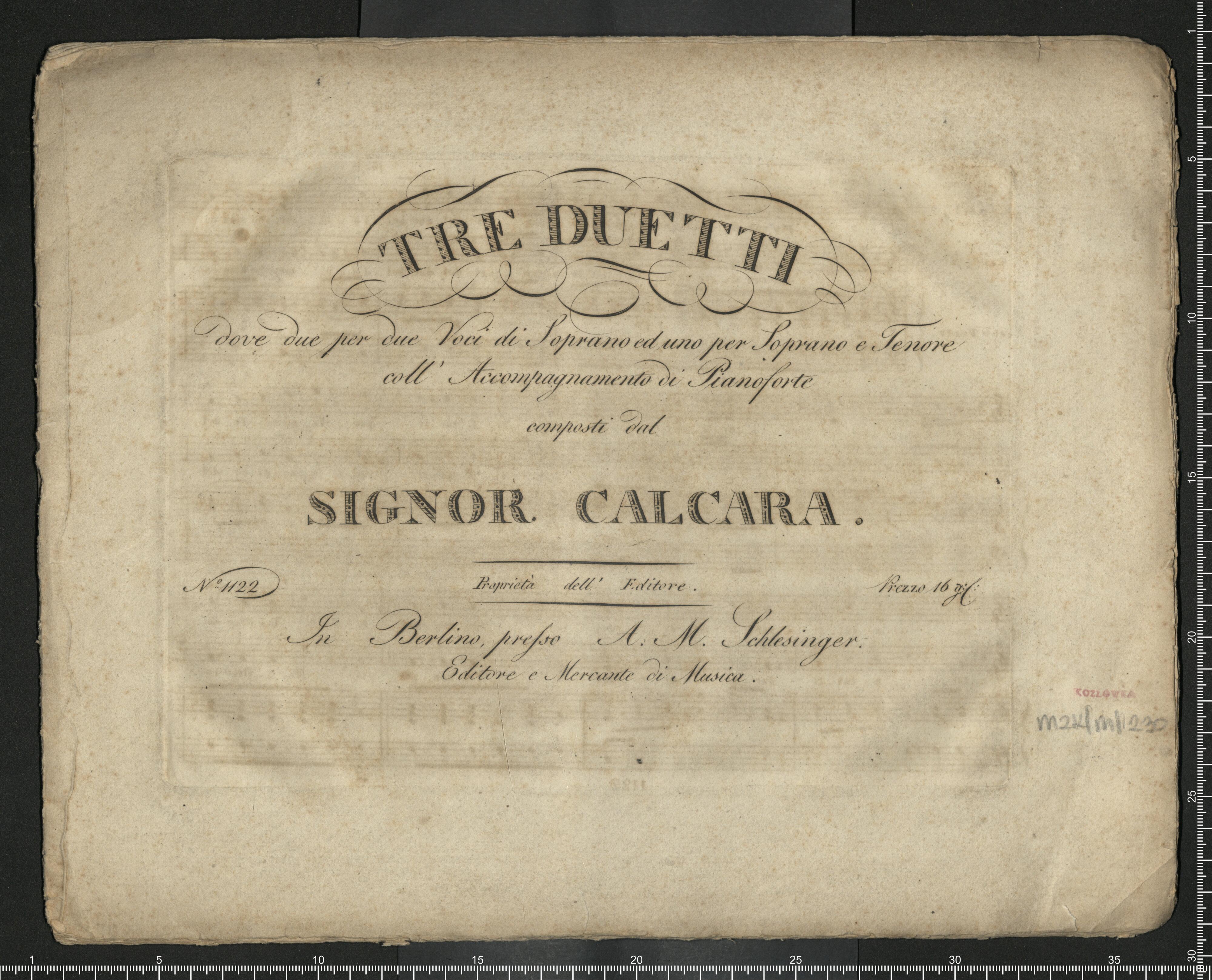 TRE DUETTI | dove due per due Voci di Soprano ed uno per Soprano e Tenore coll' Accompagnamento di Pianoforte | composti dal | SIGNOR CALCARA. | № 1122 Proprietà dell' Editore. Prezzo 16 g: | In Berlino, presso A. M. Schlesinger. | Editore e Mercante di Musica
