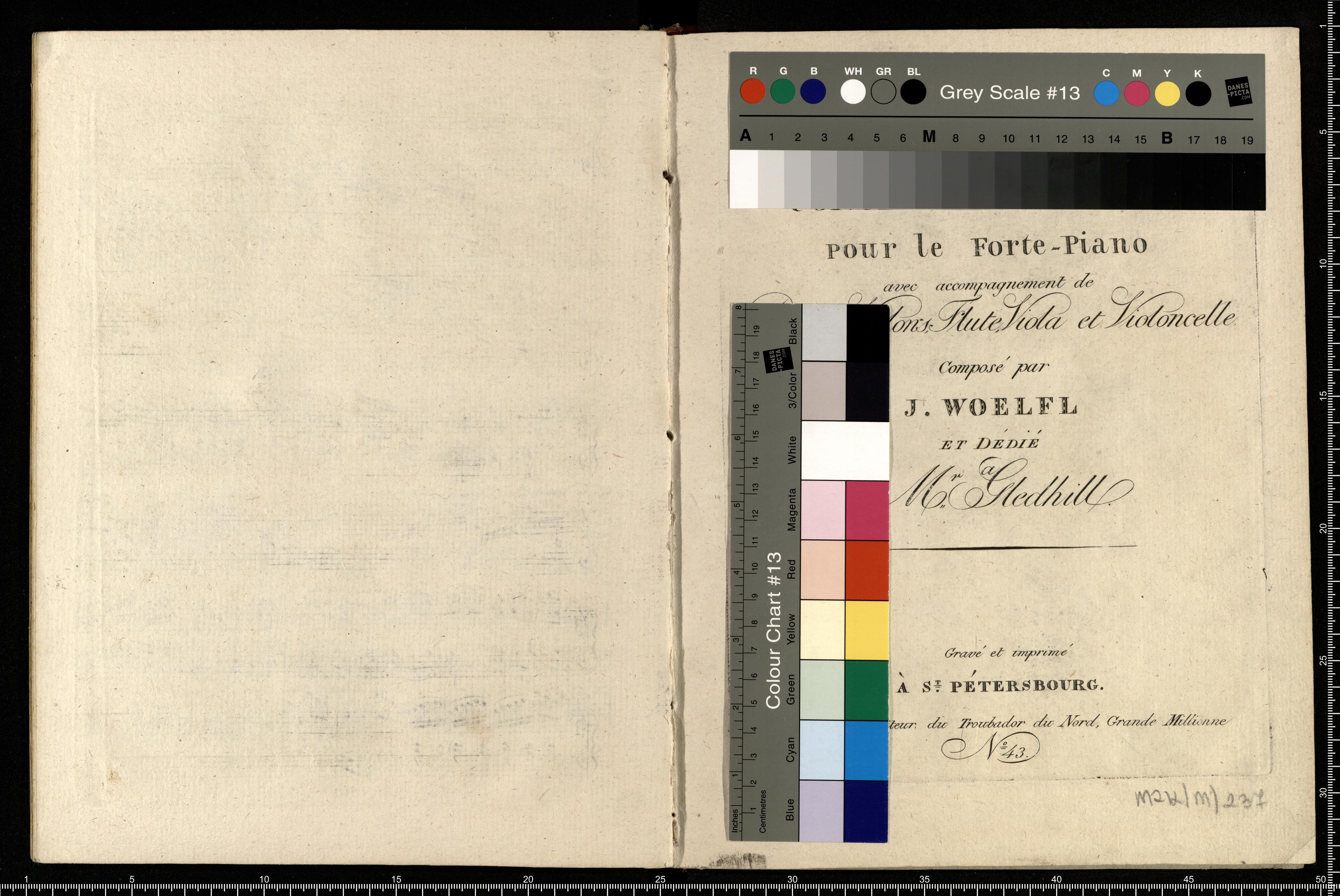 CONCERTO DA CAMERA | pour le Forte-Piano | avec accompagnement de | Deux Violons, Flute, Viola et Violoncelle | Composé par | J. WOELFL | ET DEDIÉ | a | M(r). Gledhill. | Gravé et imprimeé | À S(t). PÉTERSBOURG. | Chez DALMAS, Editeur du Troubador du Nord, Grande Millione | N° 43