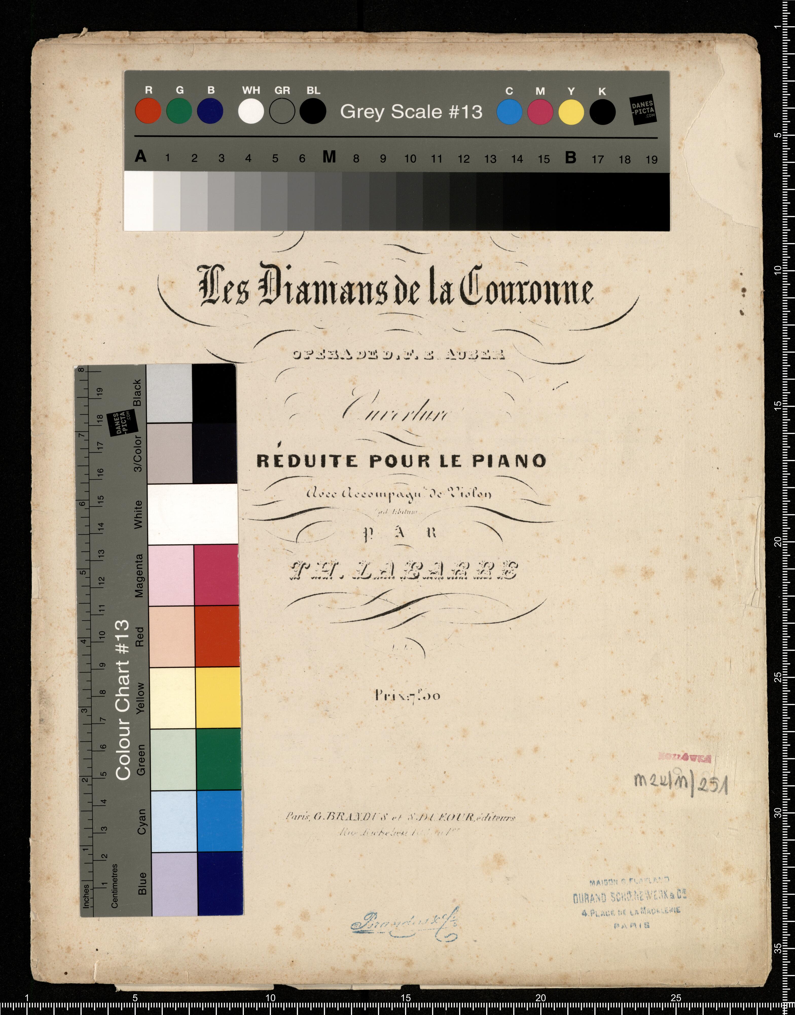 Les Diamans de la Couronne | OPERA DE D.F.E. AUBER | Ouverture | RÉDIUTE POUR LE PIANO | Avec Accompagn. de Violon | ad libitum | par | TH. LABARRE | Prix: 7.[unreadalble] | Paris, G. BRANDUS et S.DUFOUR, éditeurs | Rue [unreadable]