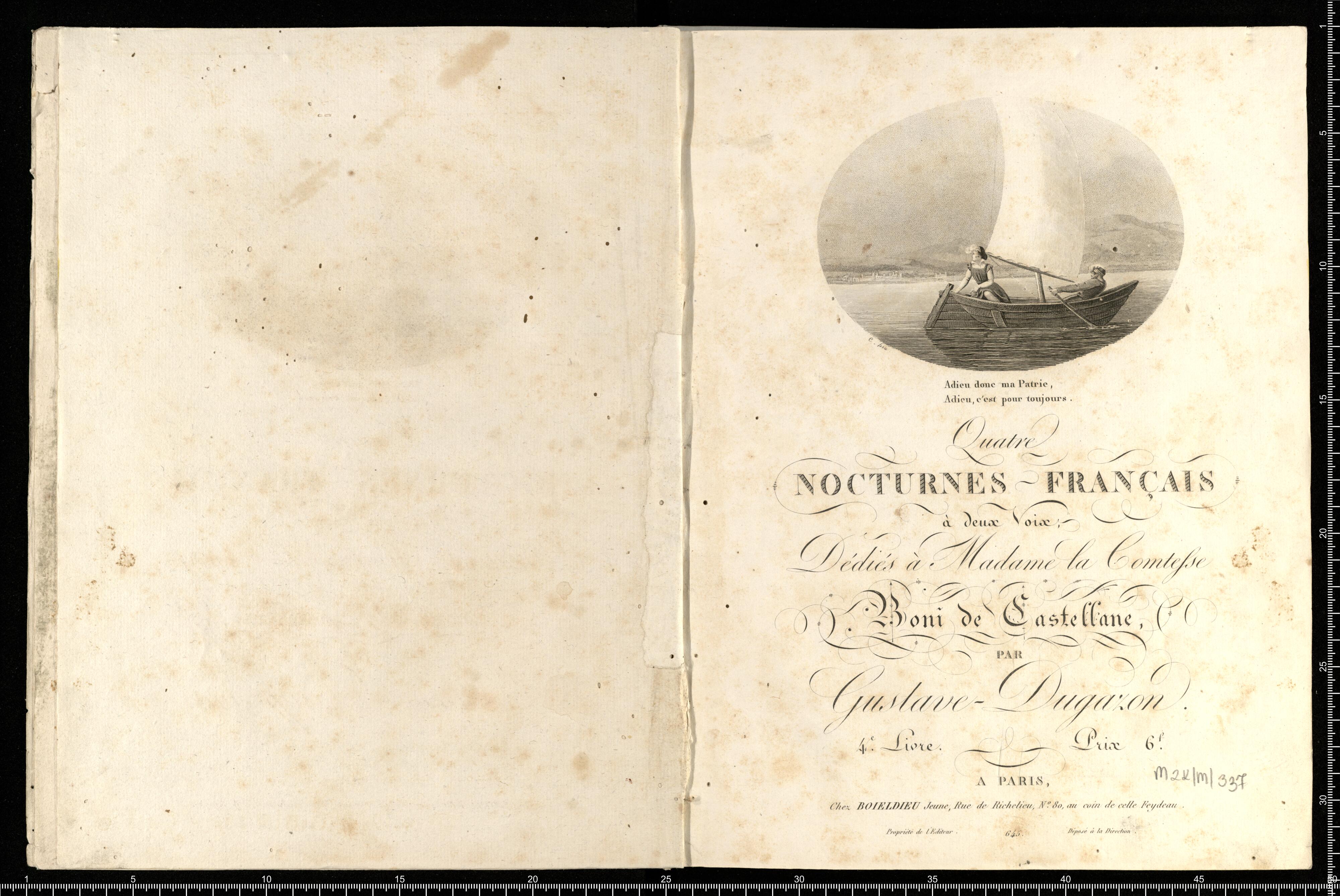 DOUX SOUVENIR, | AIR AUVERGNAT | Arrangé a deux voix | Avec accompagnament de Piano, | PAR GUSTAVE DUGAZON. | Prix: I|f. 50|e. | À PARIS, Chez BOEILDIEU, Editeur et M|d. de Musique Rue de Richelieu N|o. 80. au coin de celle Feydeau. | Et chez l'Auteur, Rue du Faubourg S|t. Denis N|o. 57. | Propriété de l'Auteur, Deposé à la D.|o|n G|l|e. de la Librairie