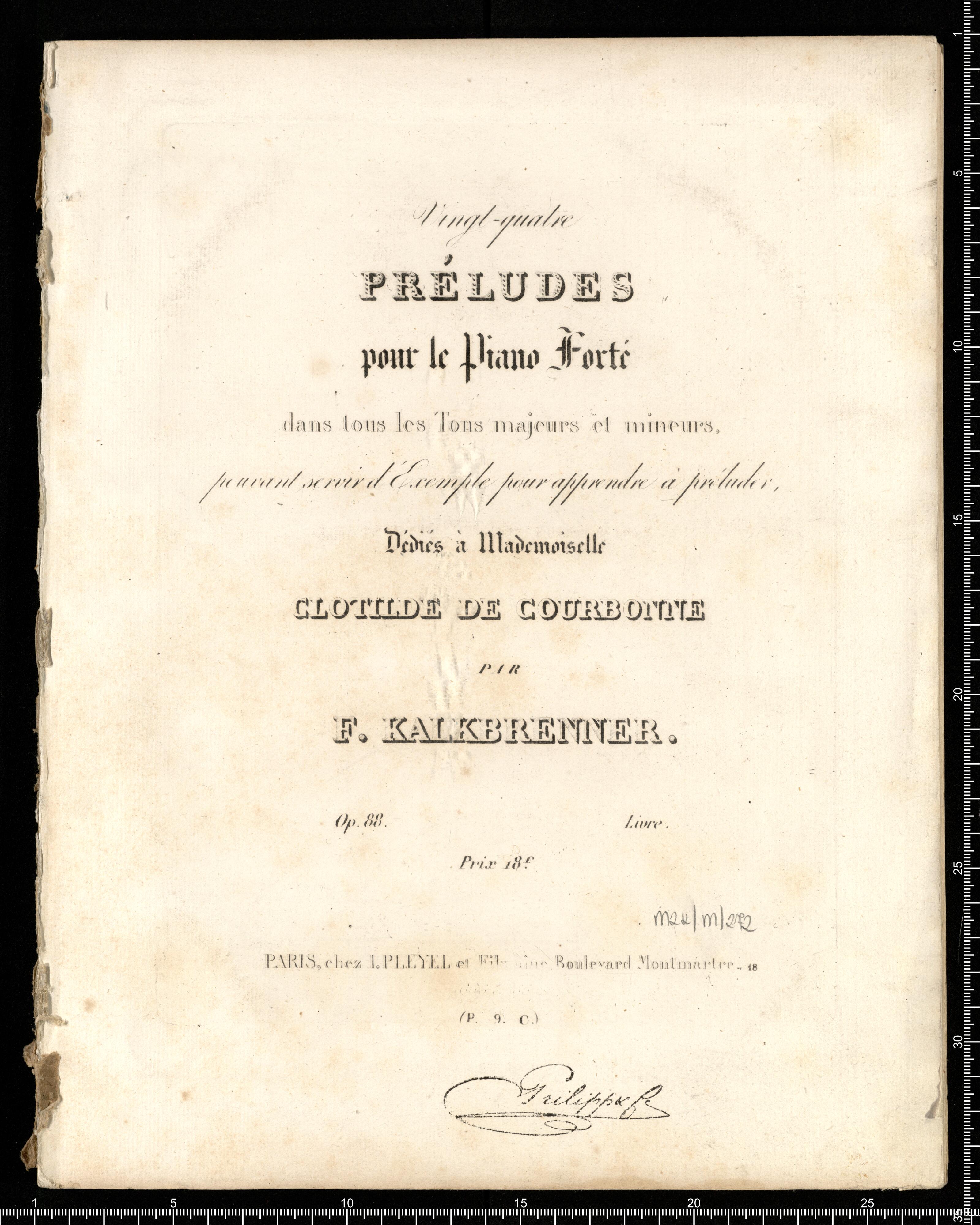 Vingt-quatre | PRÉLUDES | pour le Piano Forté | dans tous les Tons majeurs et mineurs. | pouvant servir d'Exemple pour apprendre à préluder, | Dédiés à Mademoiselle | CLOTILDE DE COURBONNE | PAR | F. KALKBRENNER. | Op 88. Livre. | Prix 18|f | PARIS, chez I. PLEYEL et Fils aîne Boulevard Montmartre. 18 | [illegible] | (P. 9. C.)