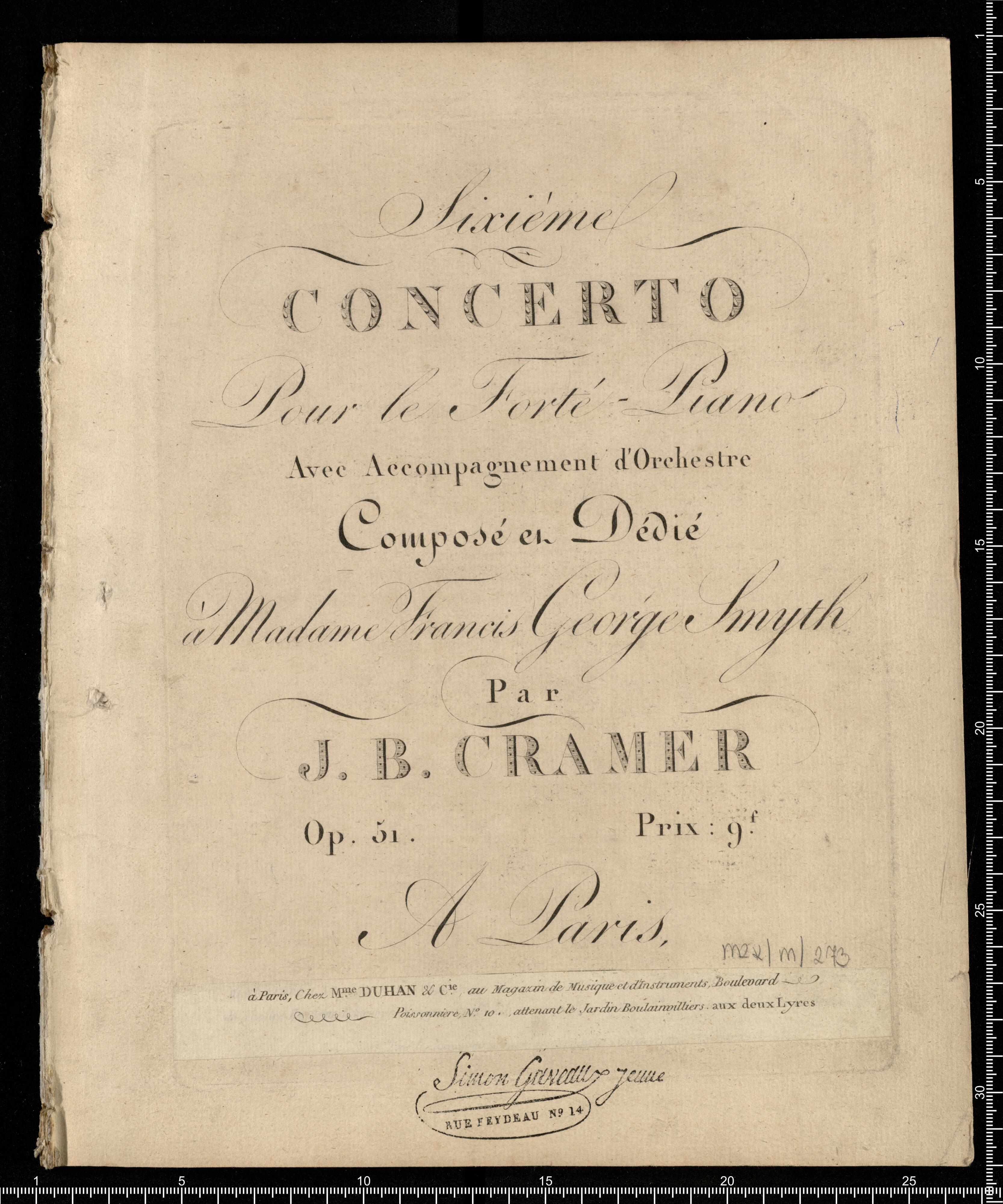 Sixième | CONCERTO | Pour le Forté Piano | Avec Accompagnement d'Orchestre | Composé et Dédié | à Madame Francis George Smyth | Par | J. B. CRAMER | Op. 51. Prix: 9|f | A Paris, | à Paris, Chez M|m|e DUHAN & C|i|e, au Magazin de Musique et d'Instruments, Boulevard | Poissonniere, N|o 10. attenant le Jardin Boulainoilliers aux deux Lyres