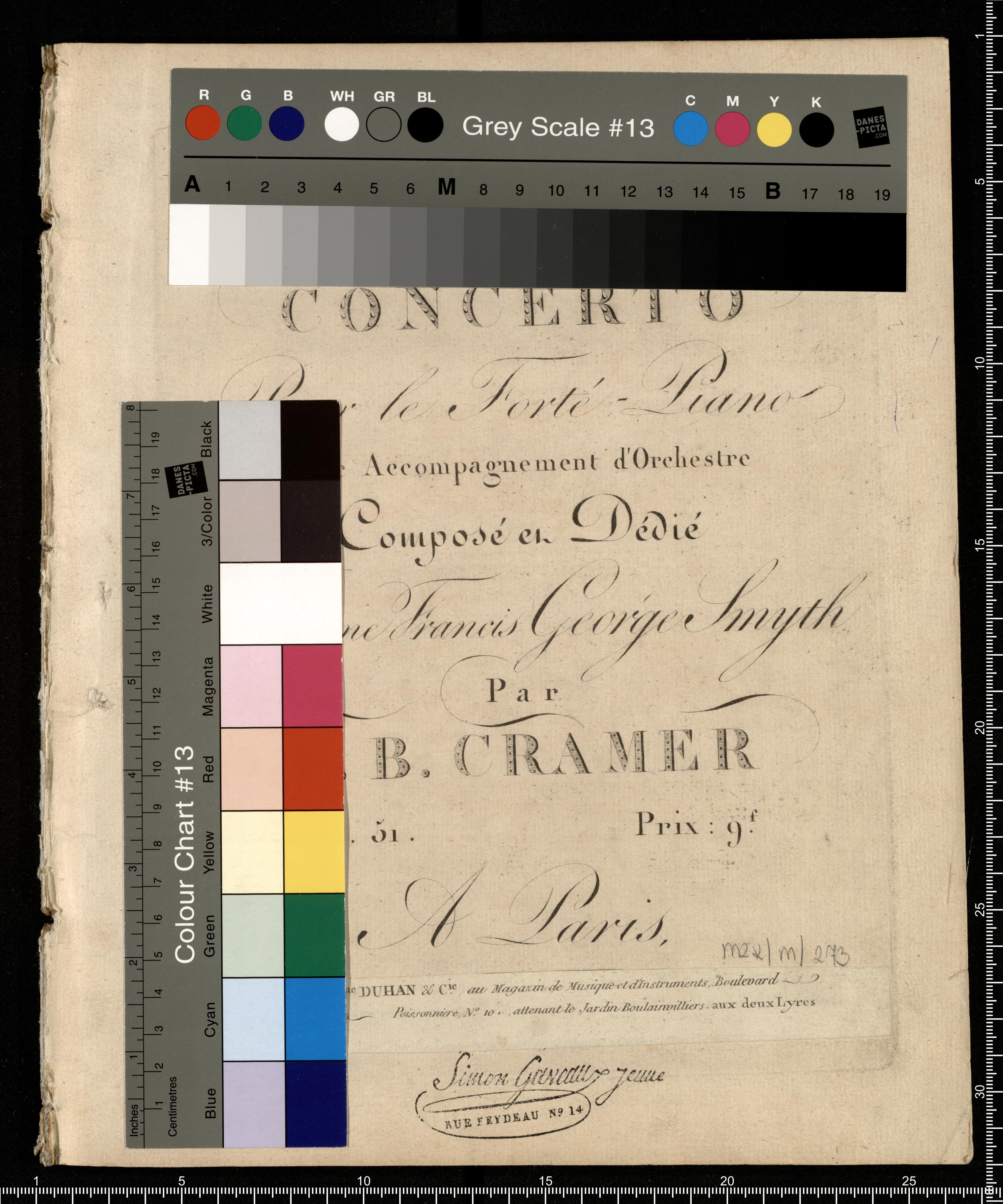 Sixième | CONCERTO | Pour le Forté Piano | Avec Accompagnement d'Orchestre | Composé et Dédié | à Madame Francis George Smyth | Par | J. B. CRAMER | Op. 51. Prix: 9|f | A Paris, | à Paris, Chez M|m|e DUHAN & C|i|e, au Magazin de Musique et d'Instruments, Boulevard | Poissonniere, N|o 10. attenant le Jardin Boulainoilliers aux deux Lyres
