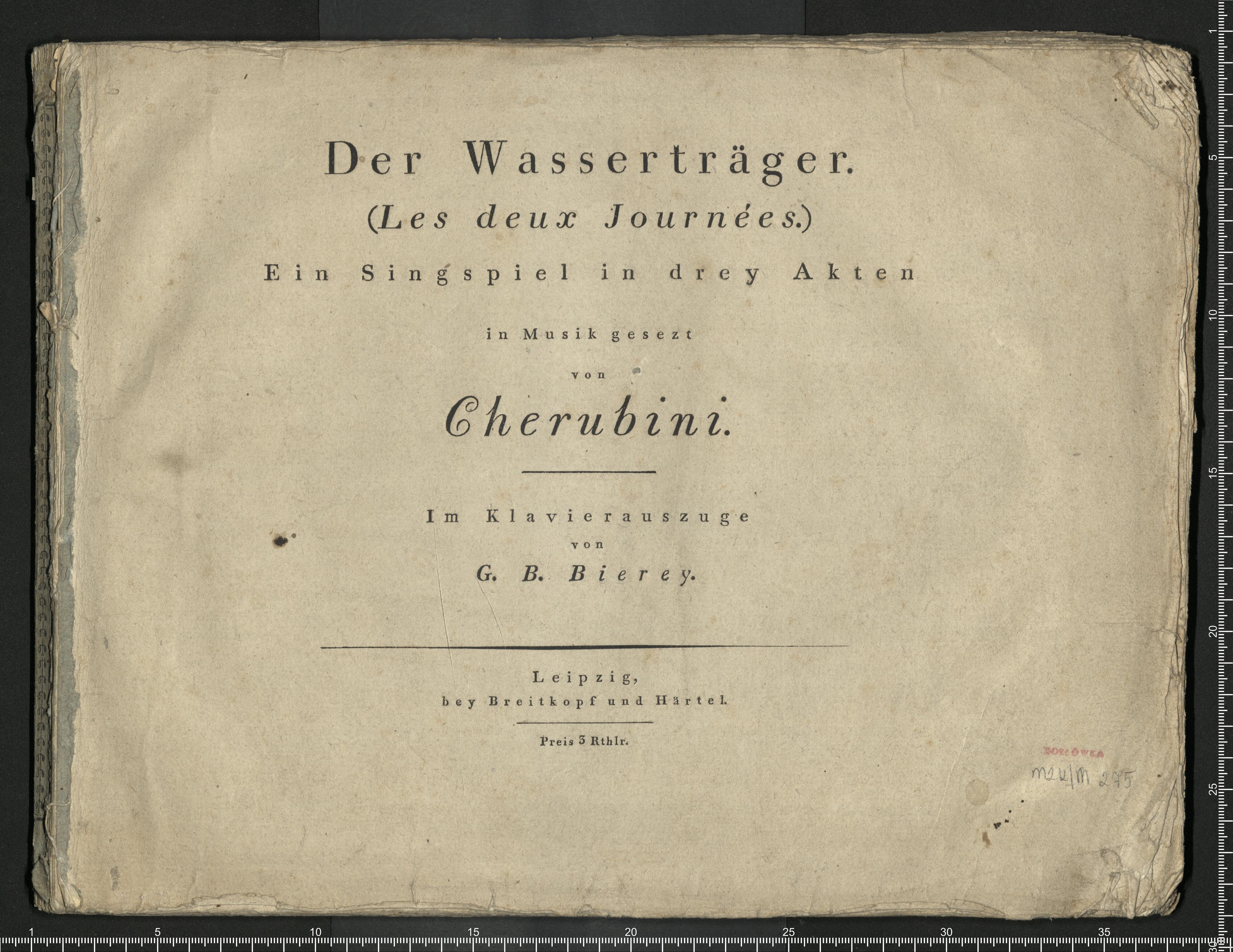 Der Wasserträger. | (Les deux Journées.) | Ein Singspiel in drey Akten | in Musik gesezt | von | Cherubini. | Im Klavierauszuge | von | G. B. Bierey. | Leipzig, | bey Breitkopf & Härtel. | Preis 3 Rthlr
