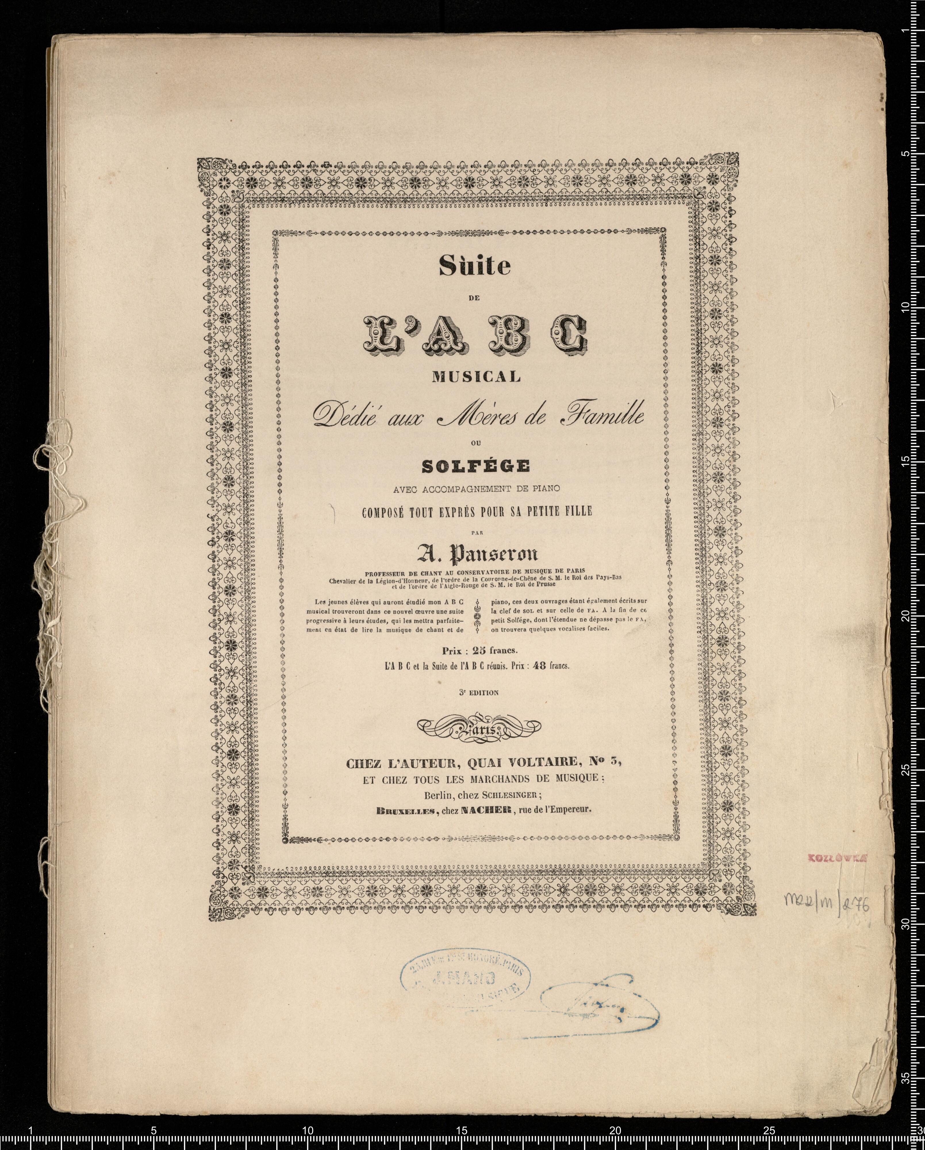 Sùite | DE | L'ABC | MUSICAL | Dédié aux Mères de Famille | OU | SOLFÉGE | AVEC ACCOMPAGNEMENT DE PIANO | COMPOSÉ TOUT EXPRÈS POUR SA PETITE FILLE | PAR | A. Panseron | PROFESSEUR DE CHANT AU CONSERVATOIRE DE MUSIQUE DE PARIS | Chevalier de la Légion-d'Honeur, de l'ordre de la Couronne-deC-Chêne de S. M. le Roi des Pays-Bas | et de l'ordre de l'Aigle-Rouge de S. M. Roi de Prusse | [left column:] Les jeunes élèves qui auront étudié mon ABC | musical trouveront dans ce nouvel œuvre une suite | progressive à leurs études, qui les mettra parfaite- | ment en état de lire la musique de chant et de [right column:] piano, ces deux ouvrages étant également écrits sur | la clef de SOL et sur celle de FA. A la fin de ce | petit Solfége, dont l'entendue ne dépasse pas le FA, | on truvera quelques vocalises faciles. | Prix: 25 francs. | L'ABC et la Suite de l'ABC réunis. Prix: 48 francs. | 3|e EDITION | Paris. | CHEZ L'AUTEUR, QUAI VOLTAIRE, N|o 3, | ET CHEZ TOUS LES MARCHANDS DE MUSIQUE; | Berlin, chez SCHLESINGER; | BRUXELLES, chez NACHER, rue de l'Empereur