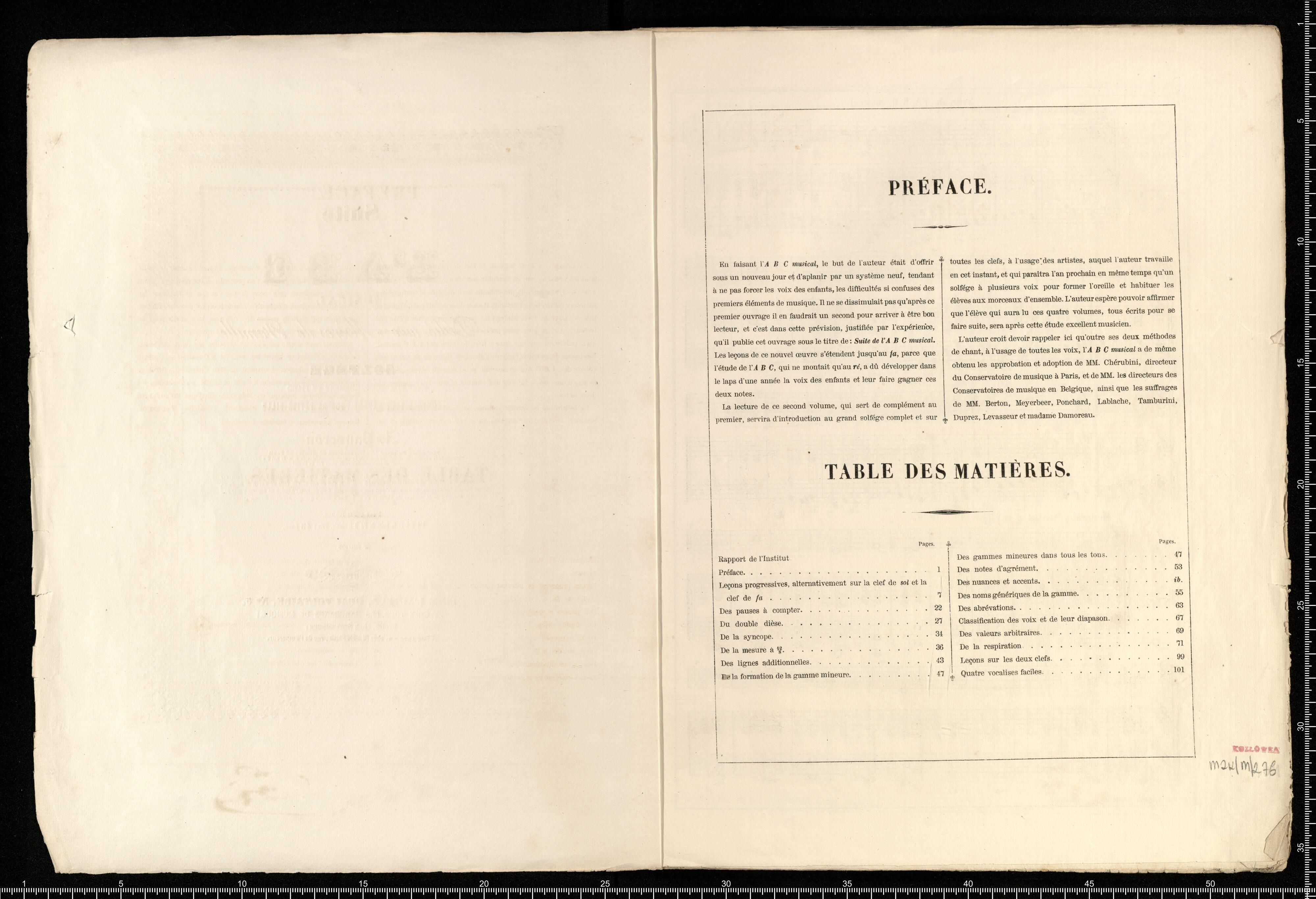 Sùite | DE | L'ABC | MUSICAL | Dédié aux Mères de Famille | OU | SOLFÉGE | AVEC ACCOMPAGNEMENT DE PIANO | COMPOSÉ TOUT EXPRÈS POUR SA PETITE FILLE | PAR | A. Panseron | PROFESSEUR DE CHANT AU CONSERVATOIRE DE MUSIQUE DE PARIS | Chevalier de la Légion-d'Honeur, de l'ordre de la Couronne-deC-Chêne de S. M. le Roi des Pays-Bas | et de l'ordre de l'Aigle-Rouge de S. M. Roi de Prusse | [left column:] Les jeunes élèves qui auront étudié mon ABC | musical trouveront dans ce nouvel œuvre une suite | progressive à leurs études, qui les mettra parfaite- | ment en état de lire la musique de chant et de [right column:] piano, ces deux ouvrages étant également écrits sur | la clef de SOL et sur celle de FA. A la fin de ce | petit Solfége, dont l'entendue ne dépasse pas le FA, | on truvera quelques vocalises faciles. | Prix: 25 francs. | L'ABC et la Suite de l'ABC réunis. Prix: 48 francs. | 3|e EDITION | Paris. | CHEZ L'AUTEUR, QUAI VOLTAIRE, N|o 3, | ET CHEZ TOUS LES MARCHANDS DE MUSIQUE; | Berlin, chez SCHLESINGER; | BRUXELLES, chez NACHER, rue de l'Empereur